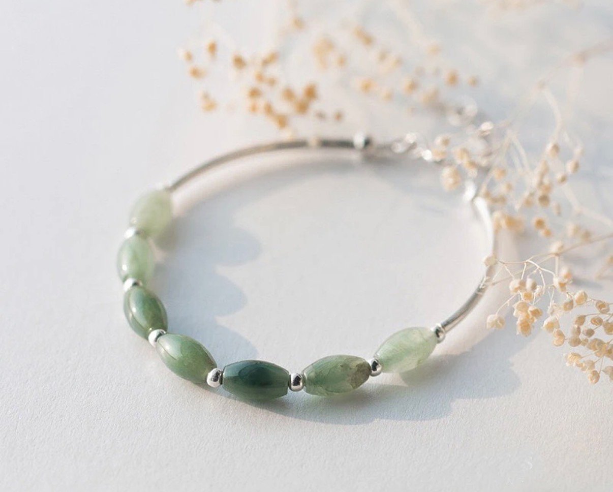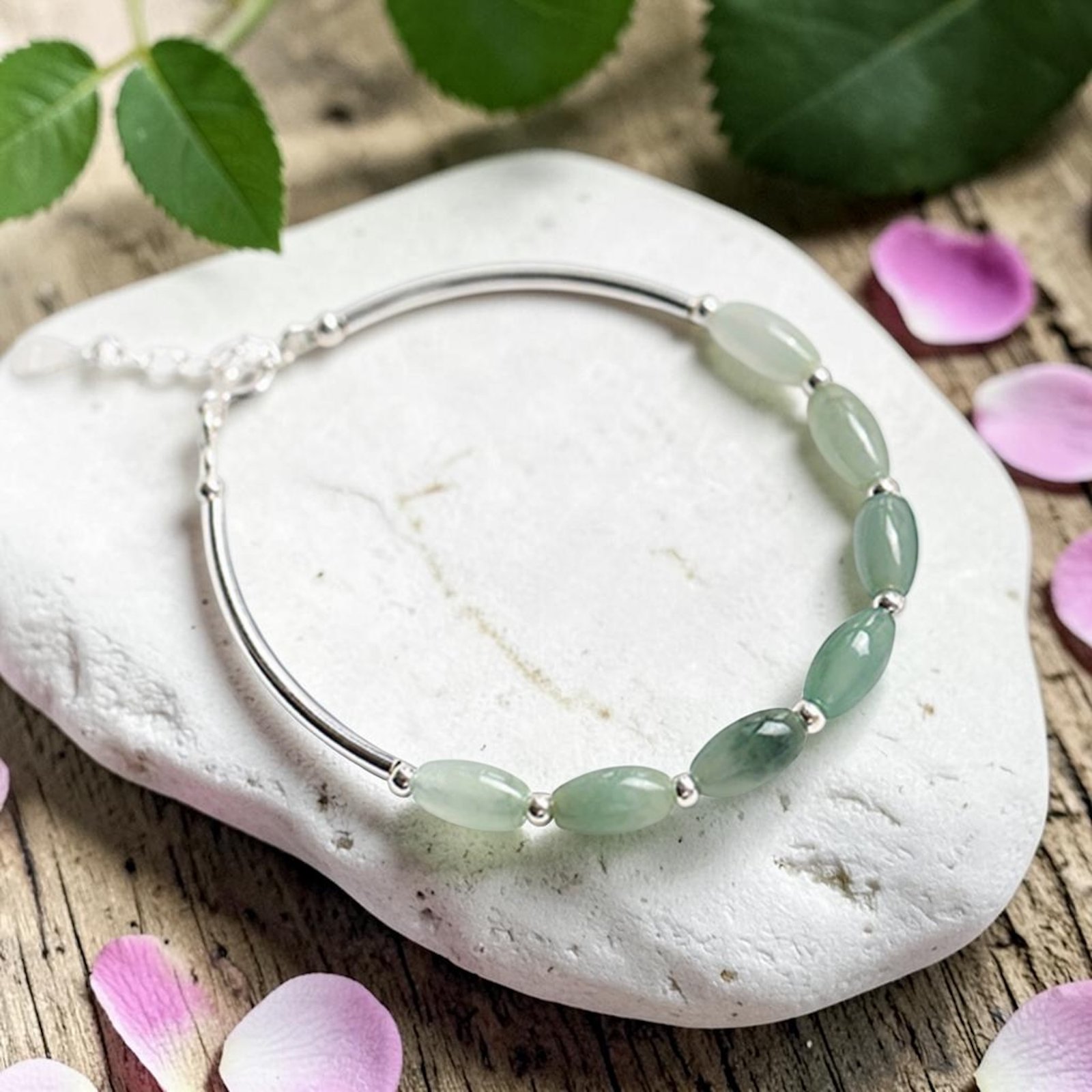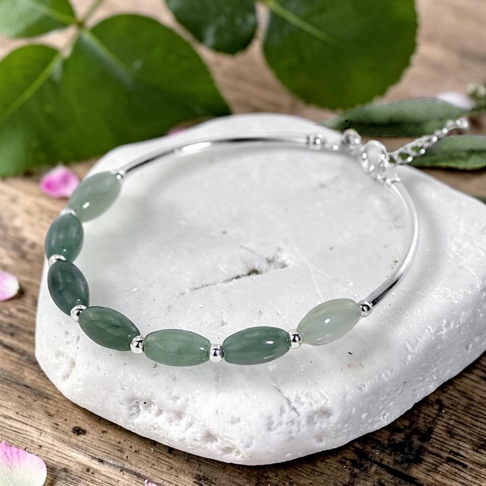 Bring calm, balance and gentle prosperity into your everyday with this beautifully crafted Green Jade Bracelet. Designed with polished oval jade beads and set on a sleek 925 sterling silver adjustable bangle, this piece blends natural beauty with modern elegance.