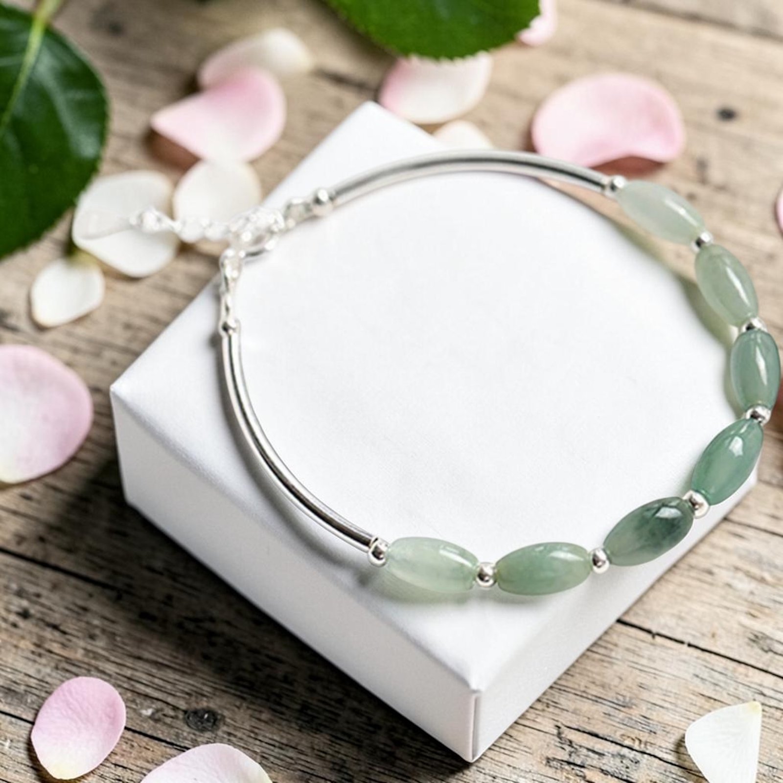 925 sterling silver green jade bracelet with oval beads. A heart chakra , Taurus, Virgo & Libra crystal for balance, luck and harmony. Adjustable fit. Gift boxed.