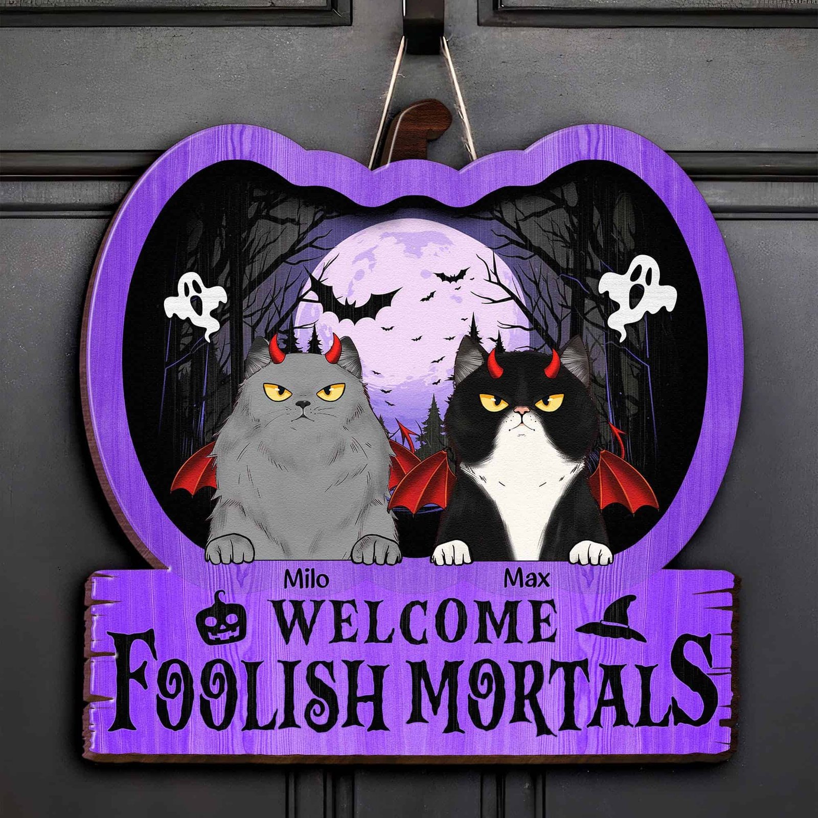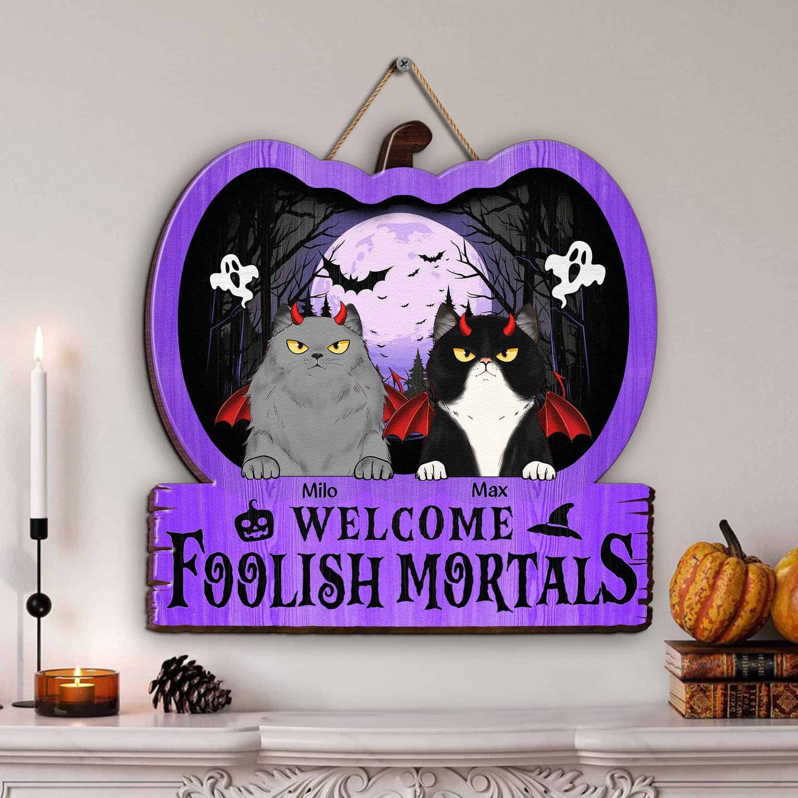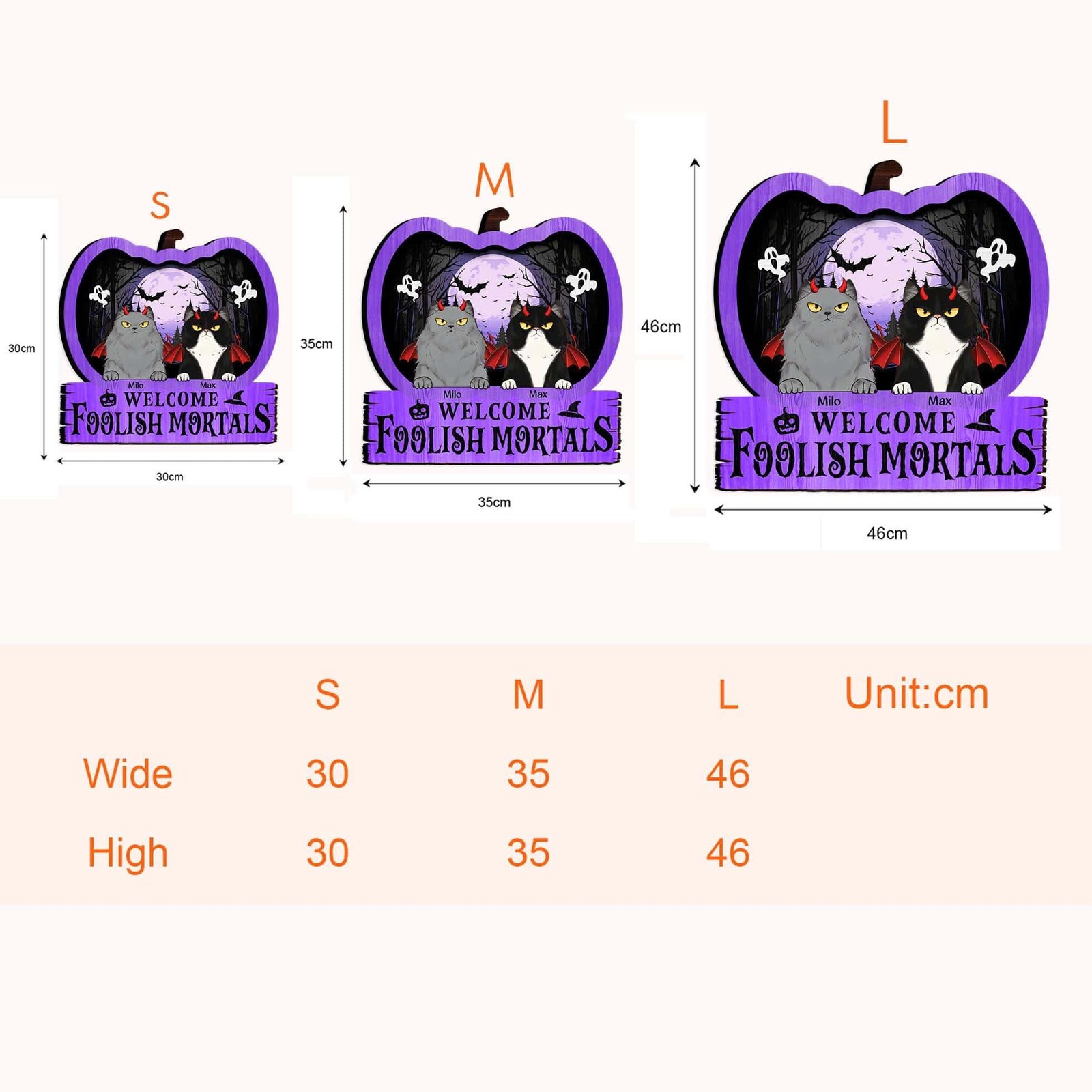 Personalised Cat Halloween Wood Sign, Welcome Foolish Mortal