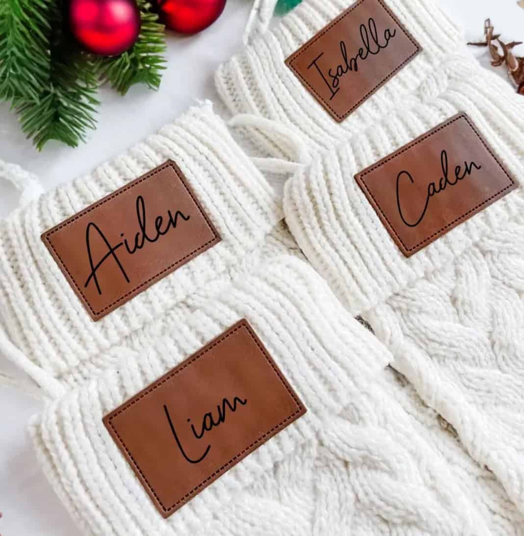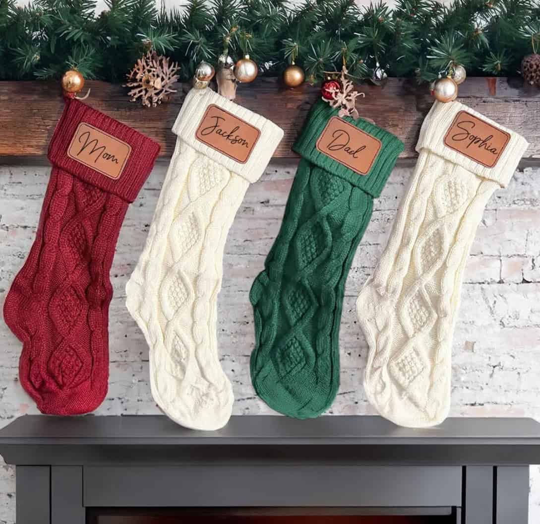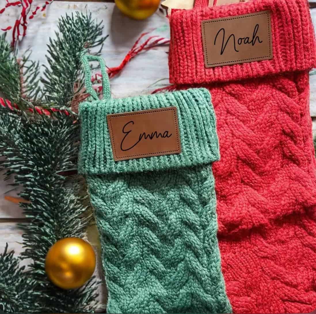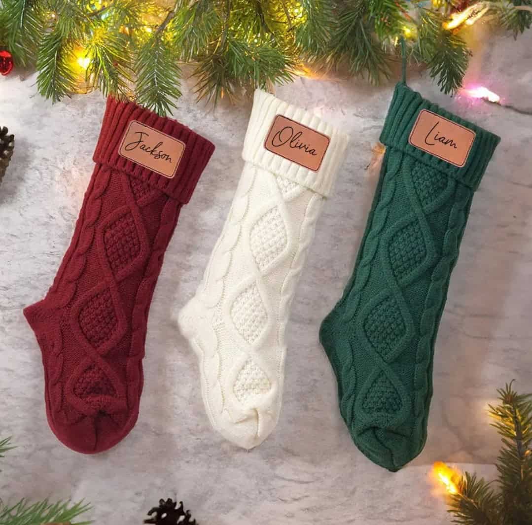 Personalised Knitted Christmas Stockings. Bring some rustic charm to your Christmas decor with knitted stockings featuring a leather patch , personalised for each family member.