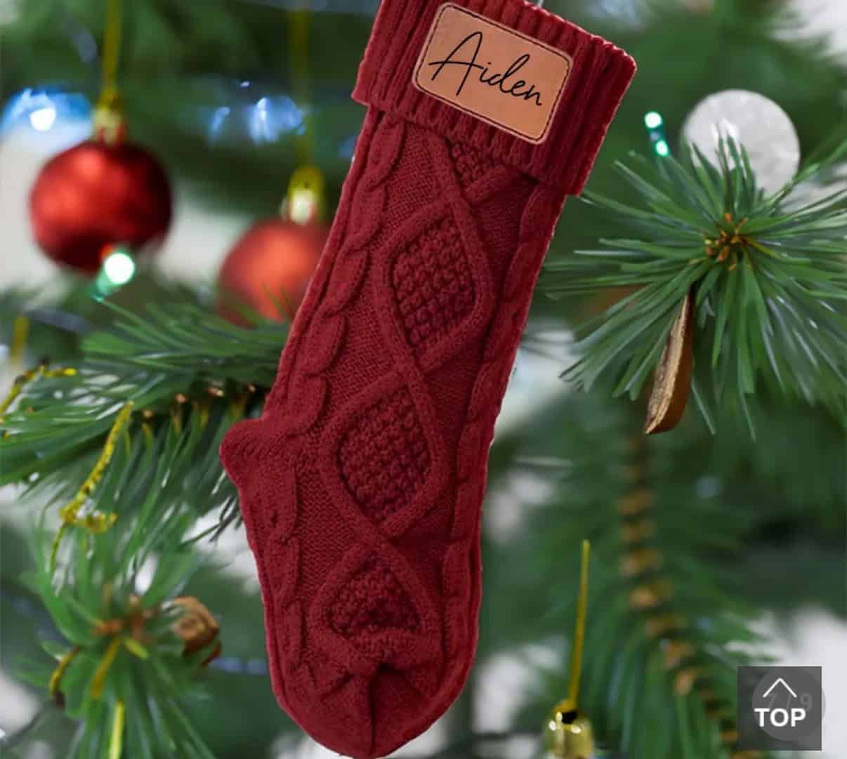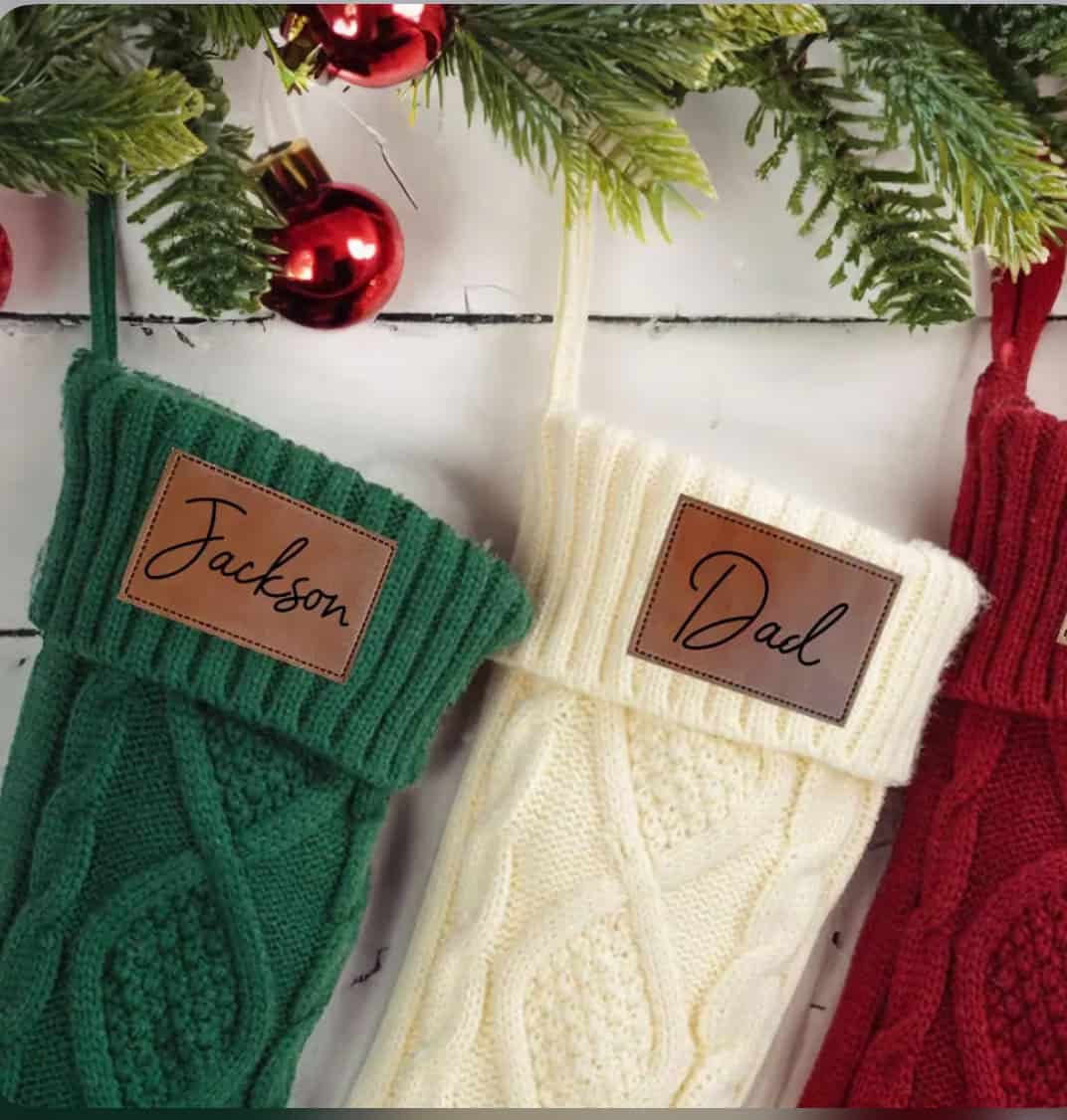 Leather Patch Detail – These stockings feature a stylish leather patch, adding a rustic and elegant element to your Christmas decorations. The leather patch is engraved with the name you enter, making these stockings truly unique.