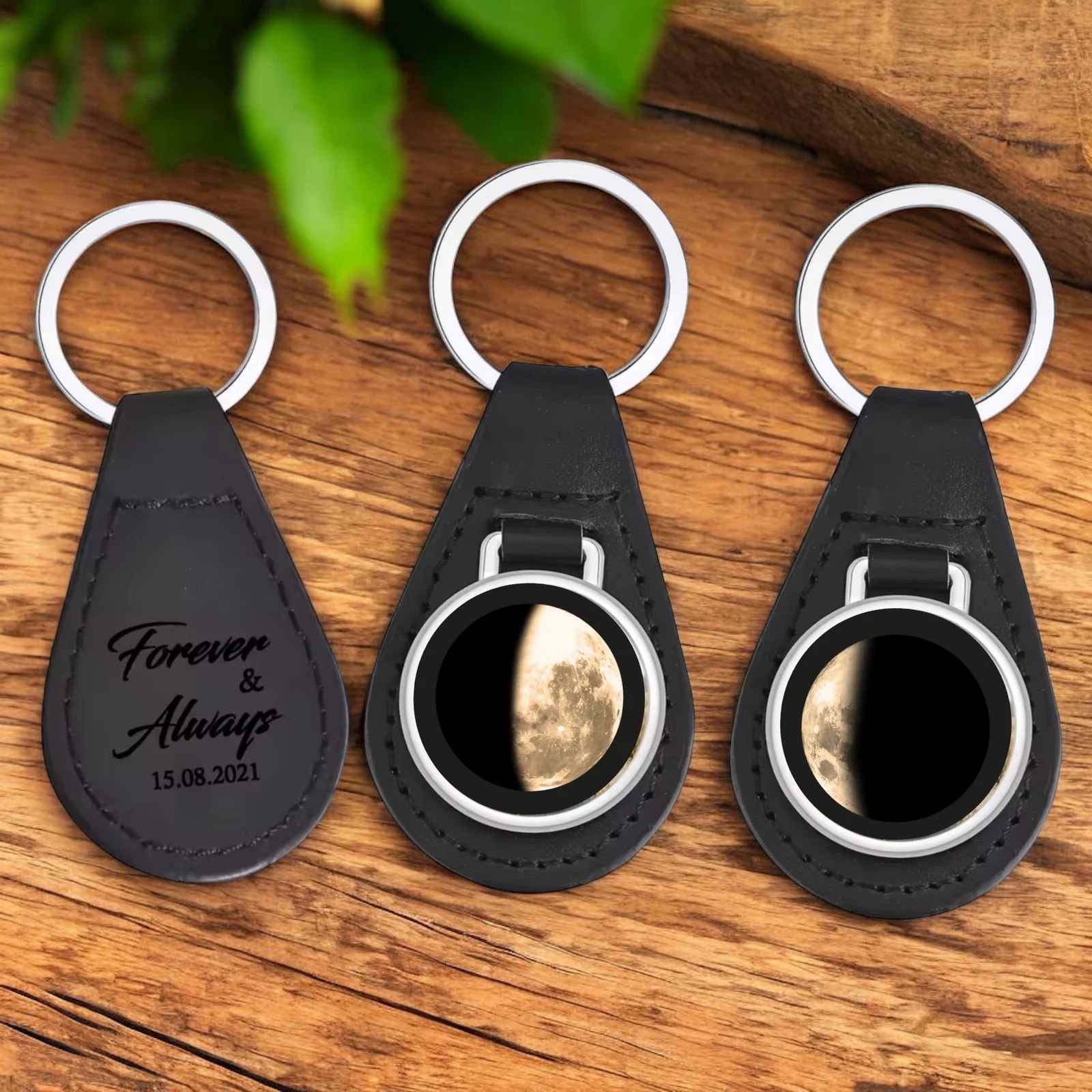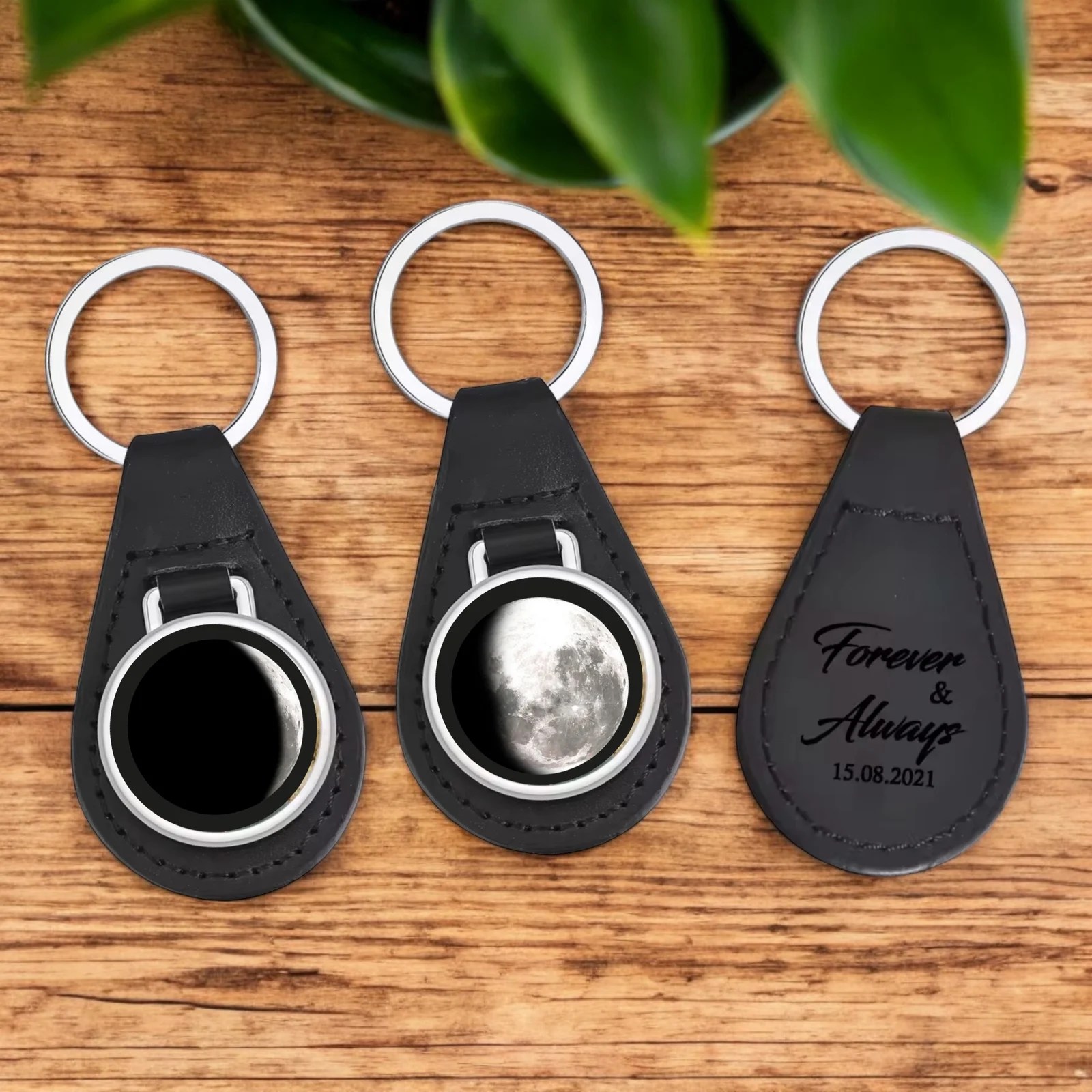 Carry a piece of the cosmos wherever you go with this beautifully crafted black leather moon phase keyring. Each piece is personalised with the exact moon phase from your chosen date, time, and location – whether it’s a birthday, anniversary, wedding, or other special event.