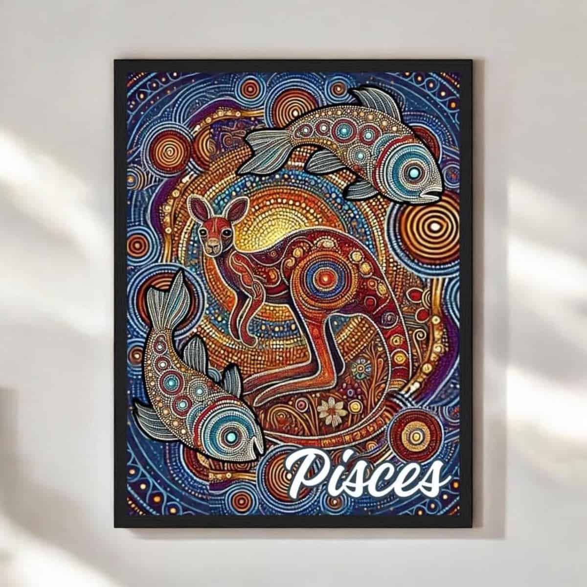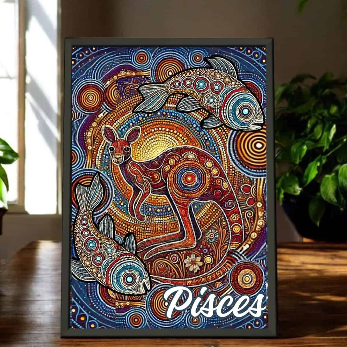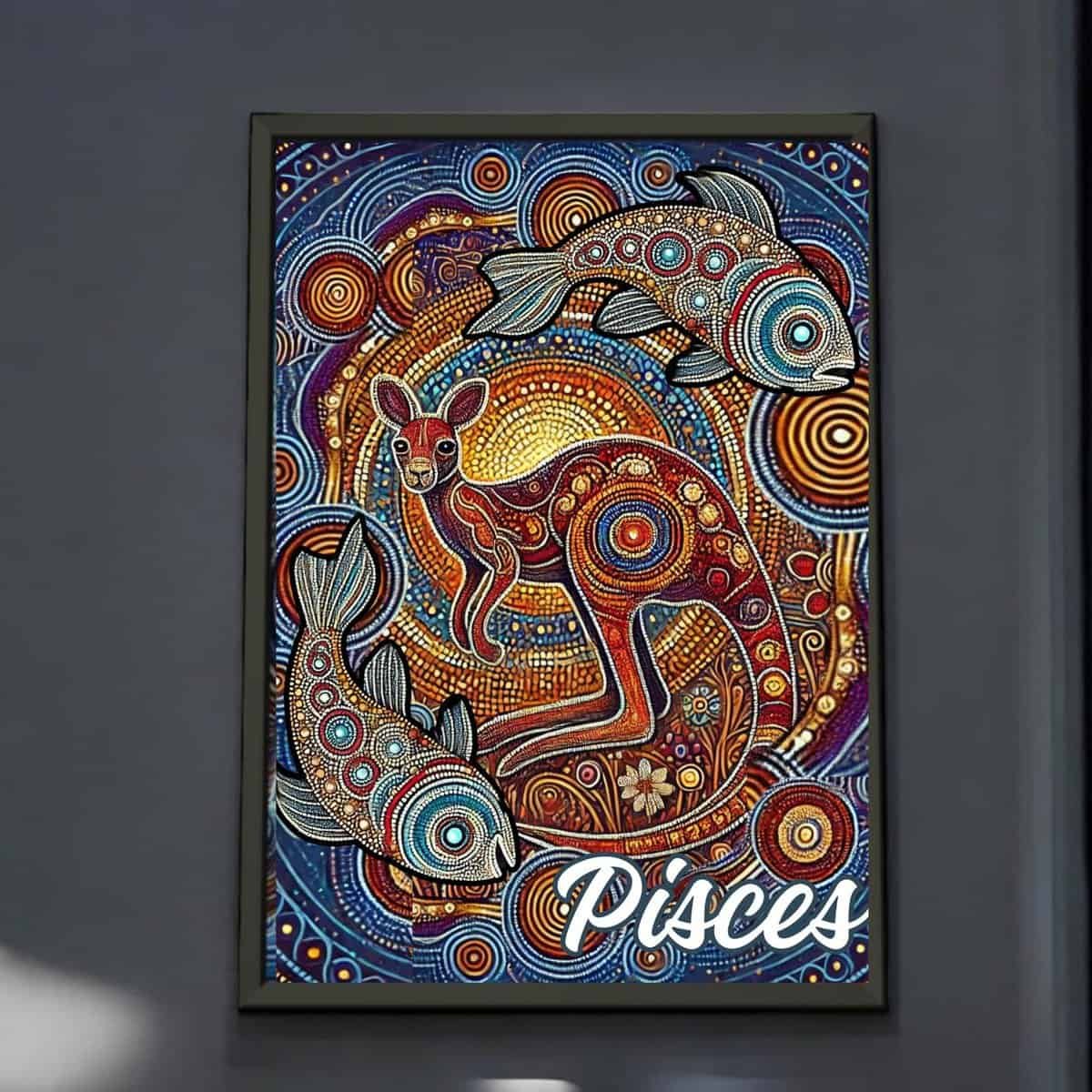 Traditional astrology meets Aboriginal astrology in this intricate dot art. Featuring the Pisces fish along with the Kangaroo in stunning earthy tones. Celebrate the Pisces zodiac season.