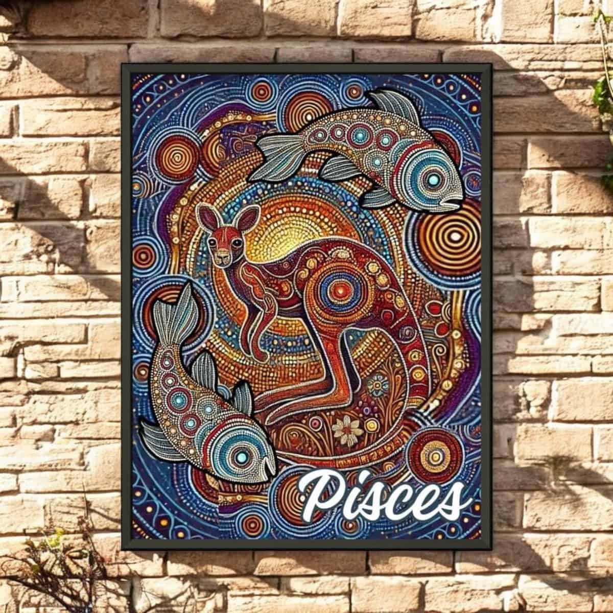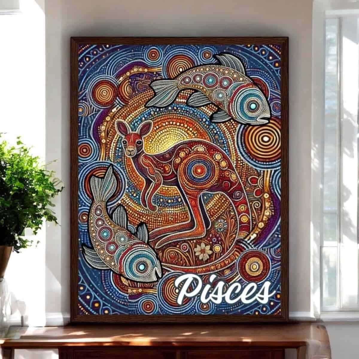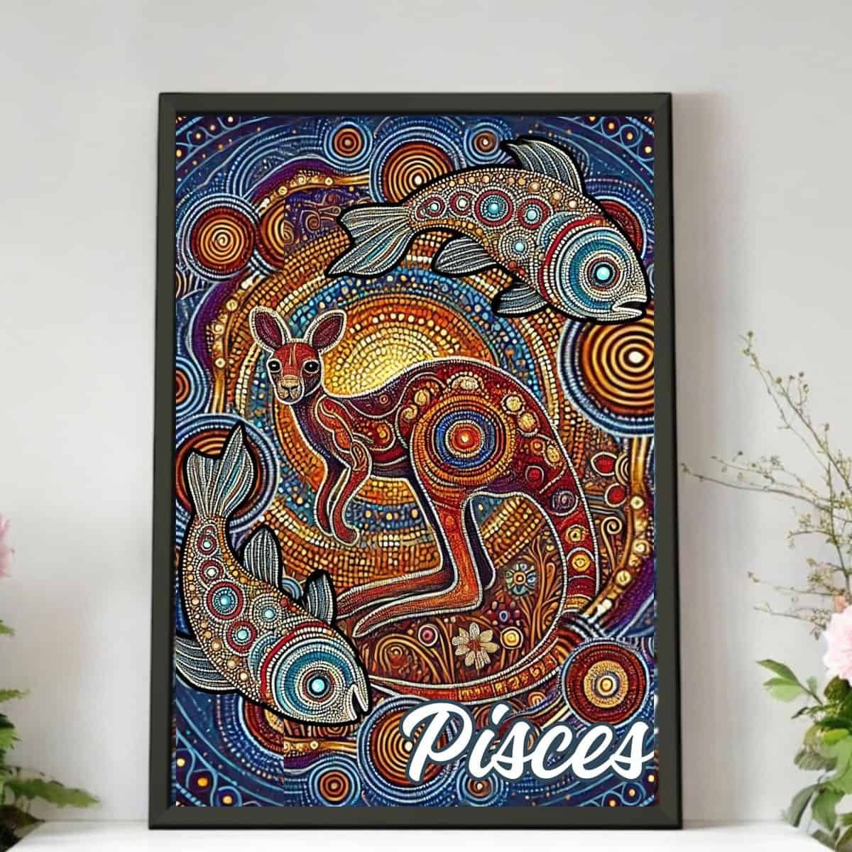 Traditional astrology meets Aboriginal astrology in this intricate dot art. Featuring the Pisces fish along with the Kangaroo in stunning earthy tones. Celebrate the Pisces zodiac season.