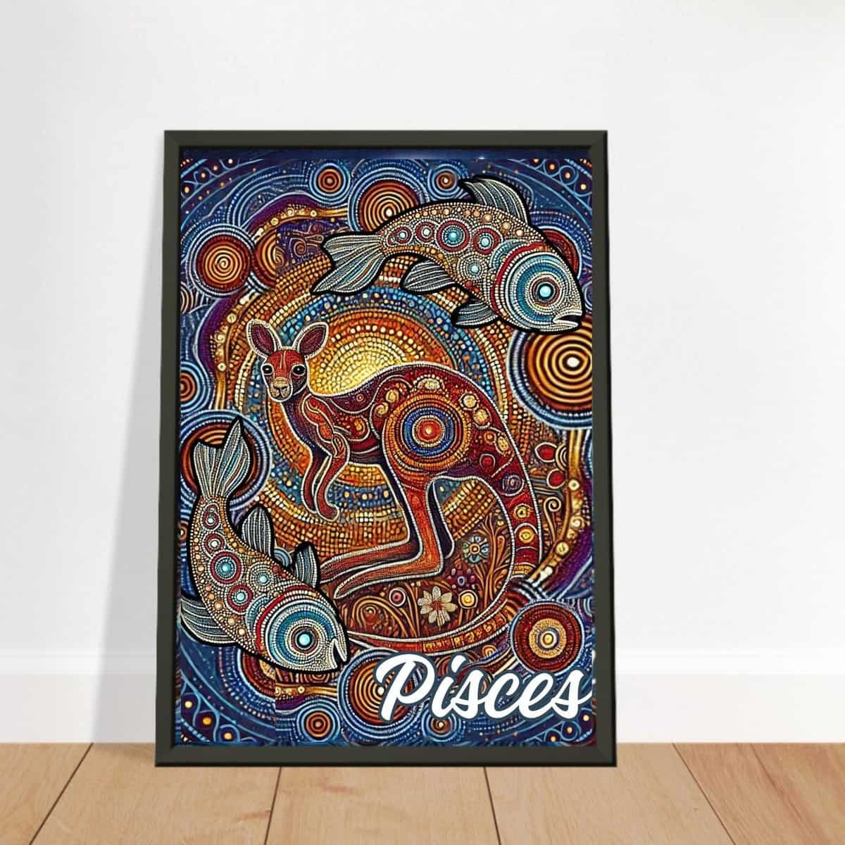 Dive into the mystical world of the Pisces sign with this captivating art print. Featuring a harmonious blend of dots, swirls and intricate patterns, this piece brings the essence of the Pisces zodiac to life. The traditional Pisces fish swimming around the Aboriginal sign of Pisces The Kangaroo. Bold earthy colours of yellow, red , brown blend with the blues of the ocean. Perfect for astrology enthusiasts or anyone looking to add a touch of enchantment to their space, this print is sure to captivate and inspire.