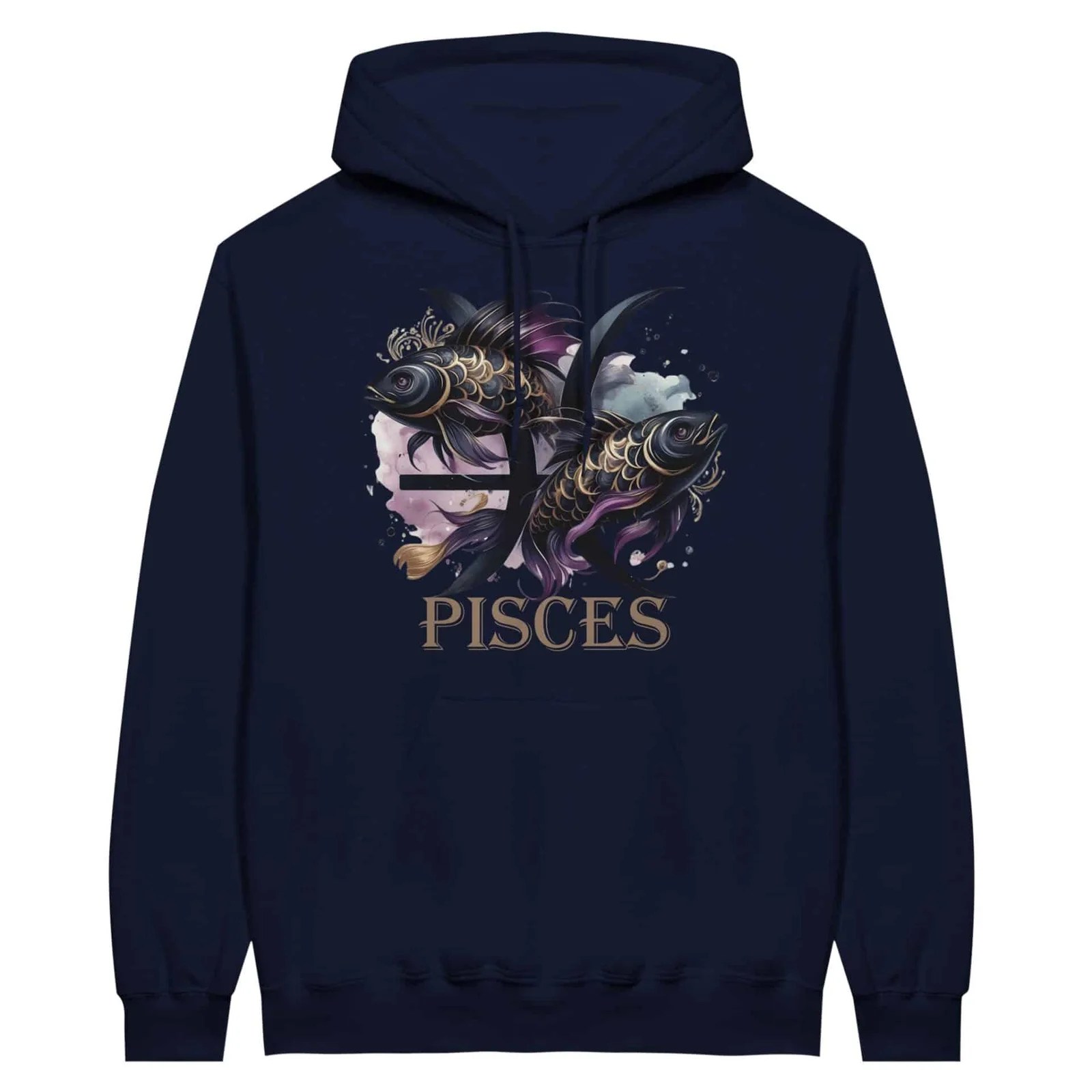 A classic hoodie with a large front pouch pocket and drawstrings in matching colour. Printed with our stunning Pisces Fish Design.