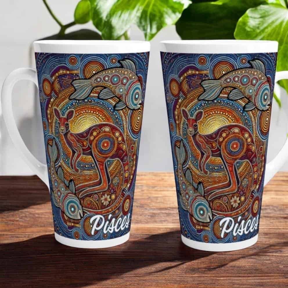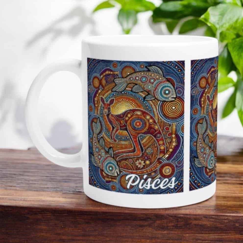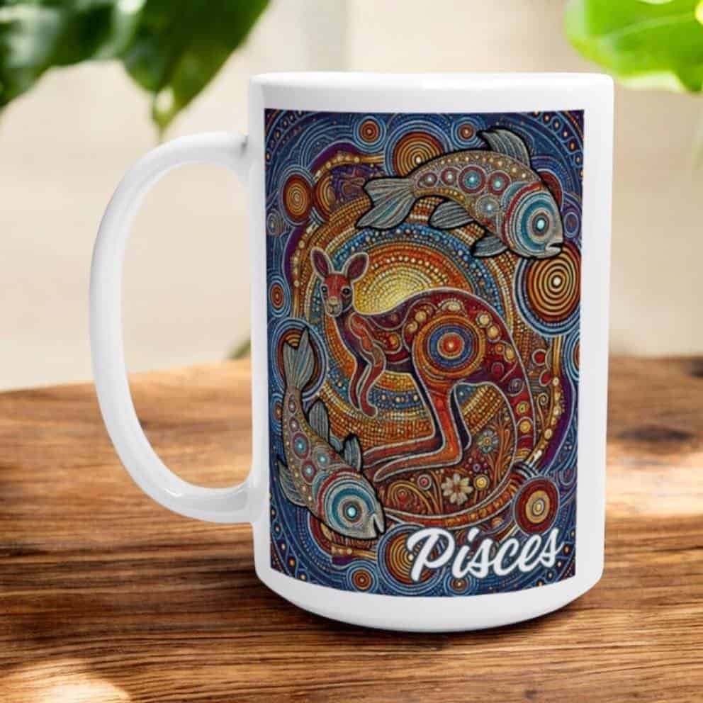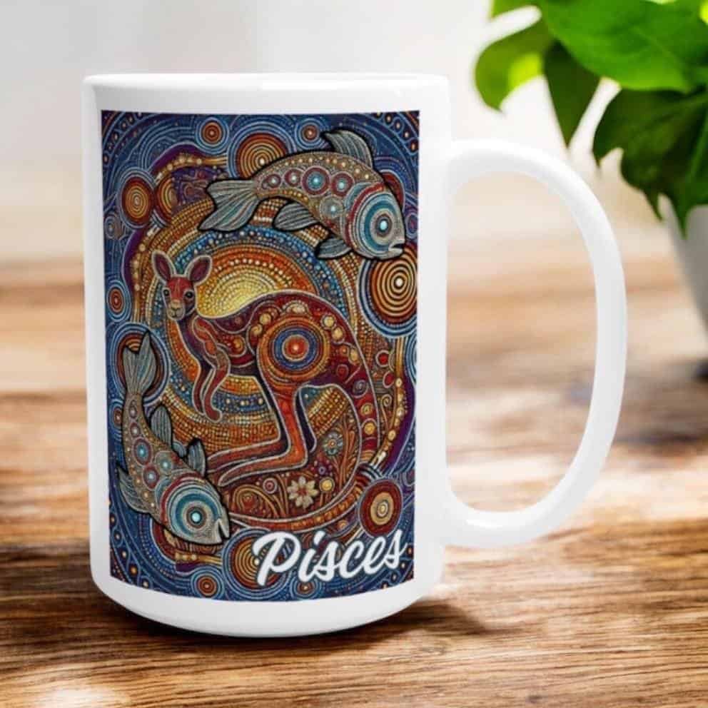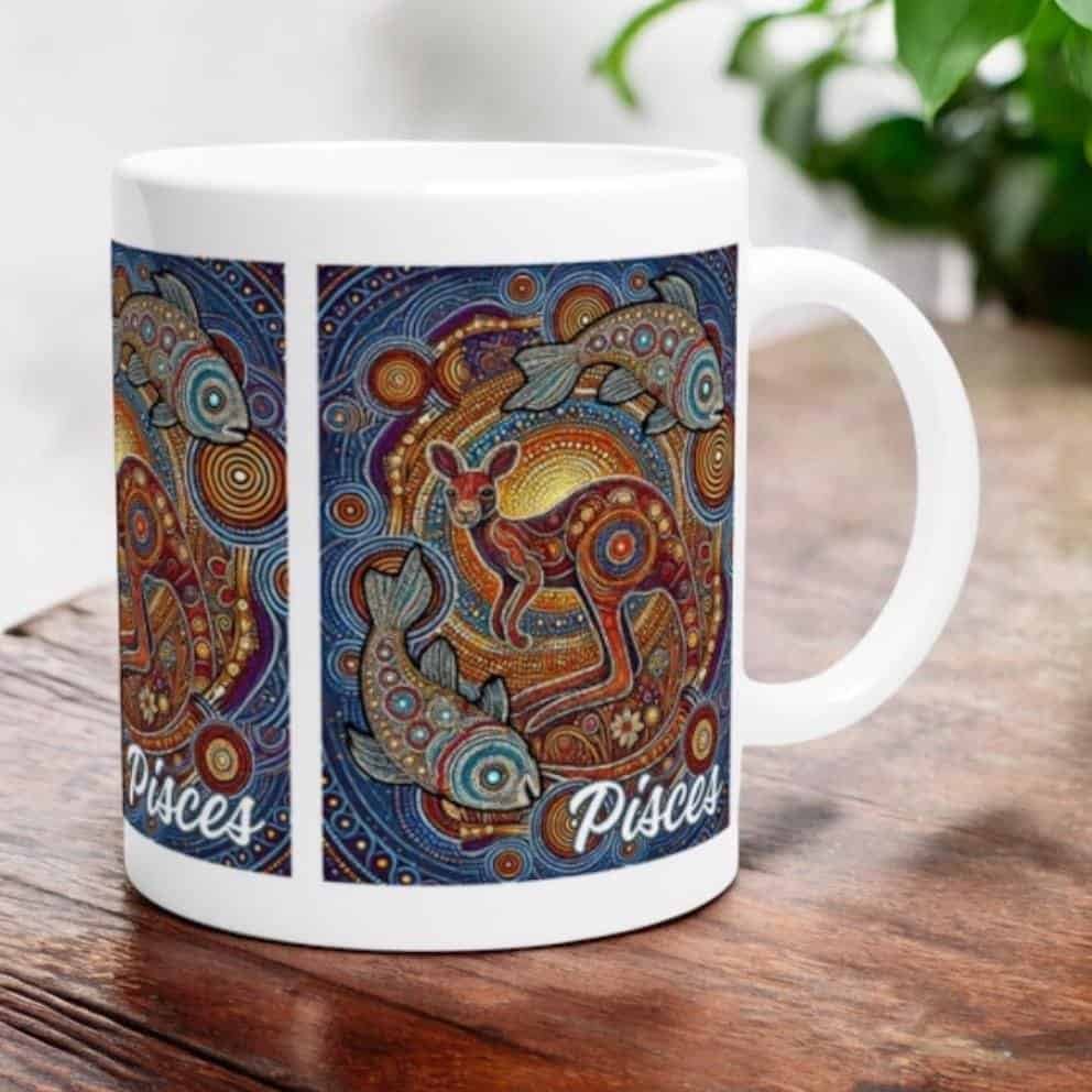 Pisces Fish & Kangaroo Aboriginal Art Zodiac Mug. Traditional astrology meets Aboriginal astrology with this beautiful Aboriginal design, printed on ceramic mugs.