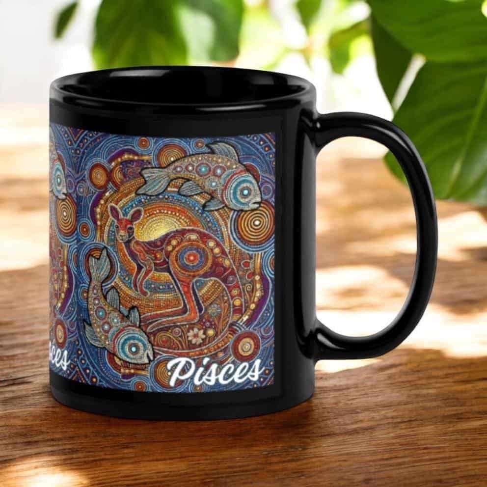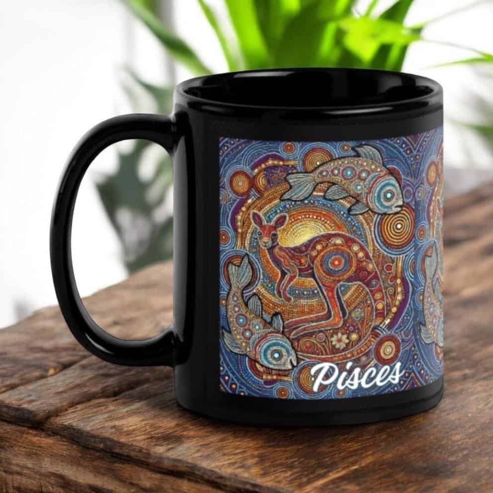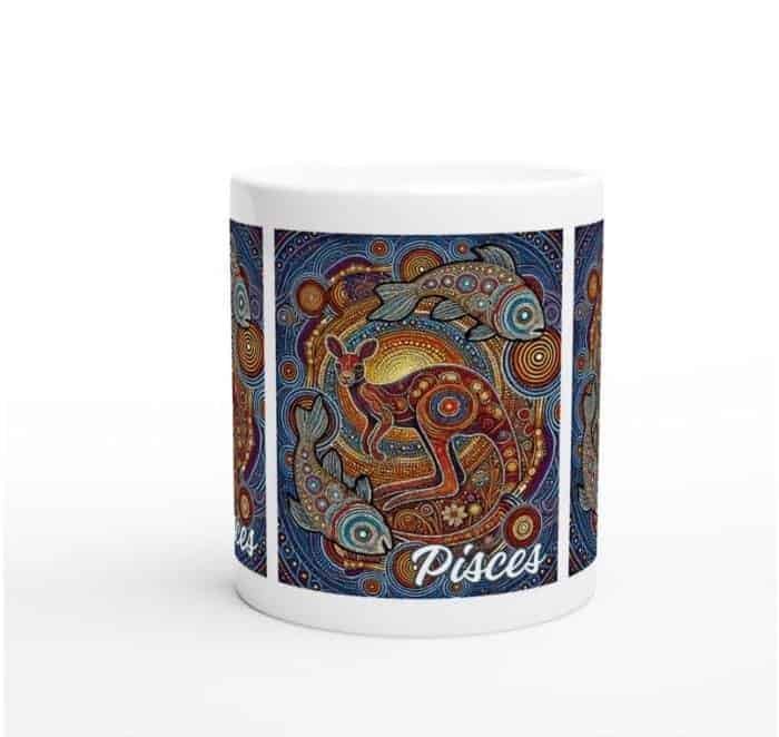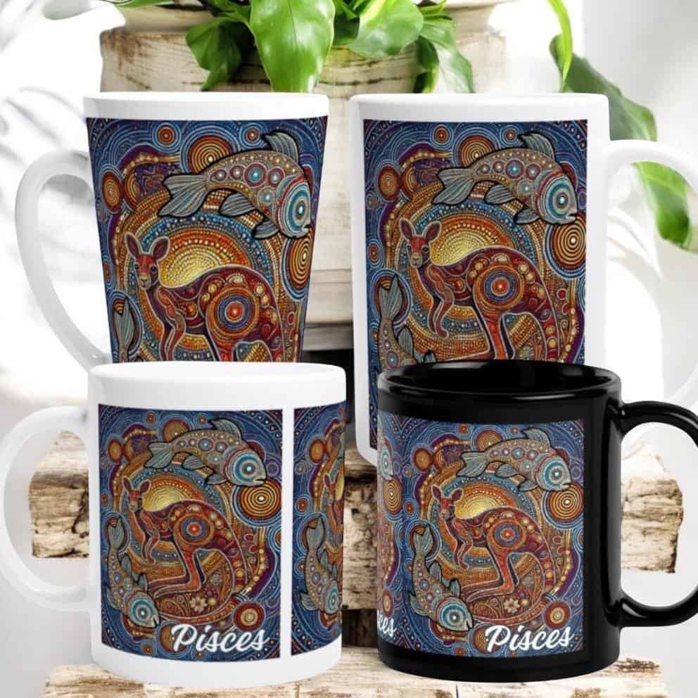 Pisces Fish & Kangaroo Aboriginal Art Zodiac Mug Immerse yourself in the mystical allure of the zodiac with our captivating Pisces Aboriginal Zodiac Art Print. This stunning piece is a celebration of the Pisces sign, beautifully illustrated with intricate patterns and vibrant colors that capture the essence of Pisces.