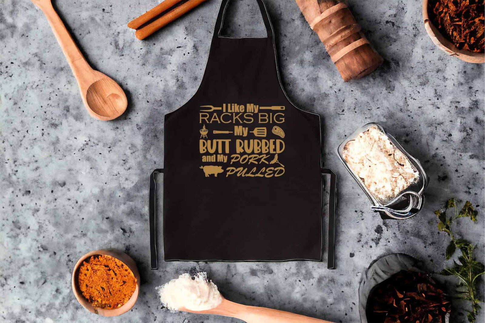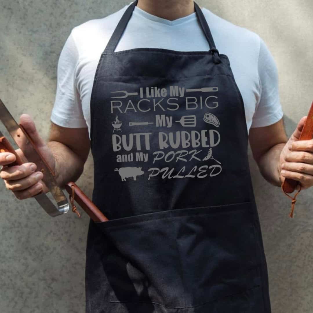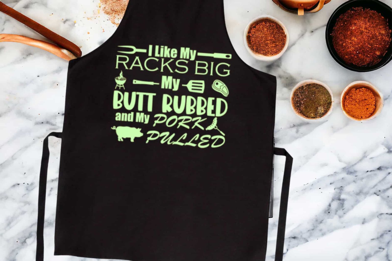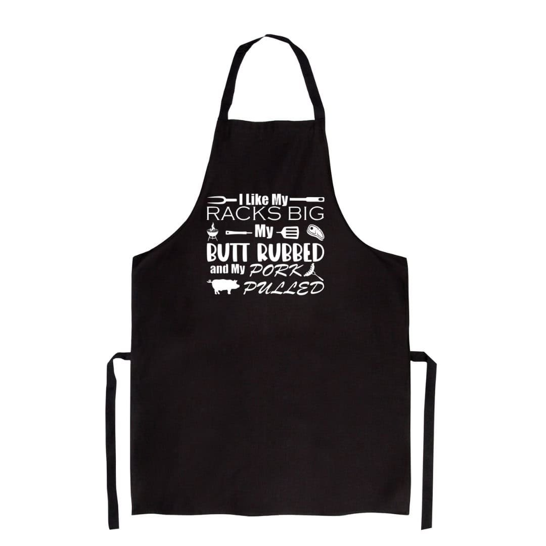 Racks Big – Butt Rubbed – Pork Pulled BBQ Apron It’s the Perfect gift for bbq chefs, meat smokers, and general meat lovers.