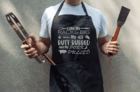 This Racks Big – Butt Rubbed – Pork Pulled BBQ apron is the perfect gift for the man or woman that has everything! In fact it is the perfect gift for any meat lover!