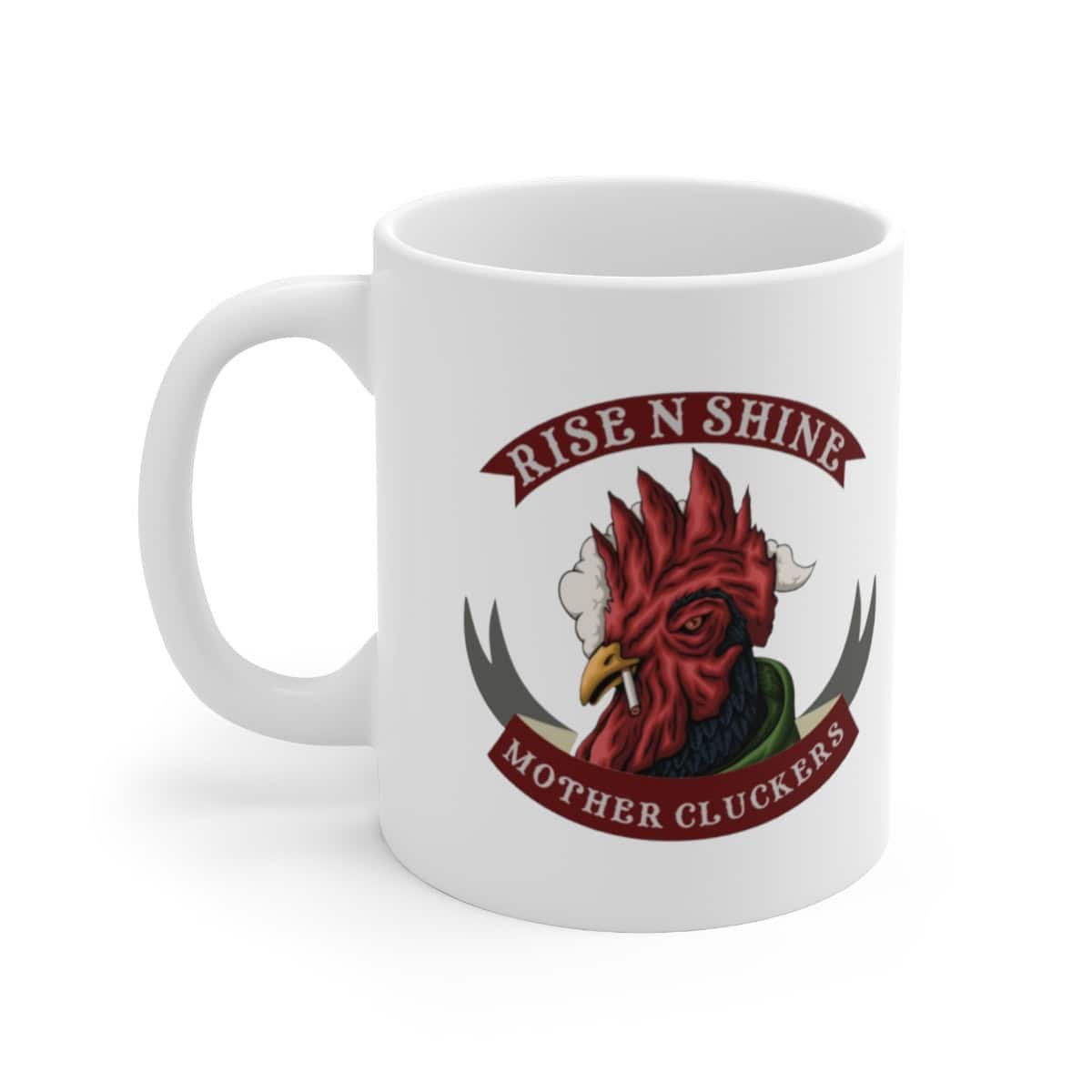 Rise n Shine Mother Cluckers Coffee Mug. Featuring our tough rooster, wearing a leather jacket and smoking a cigarette design. This mug is a hit for almost anyone.