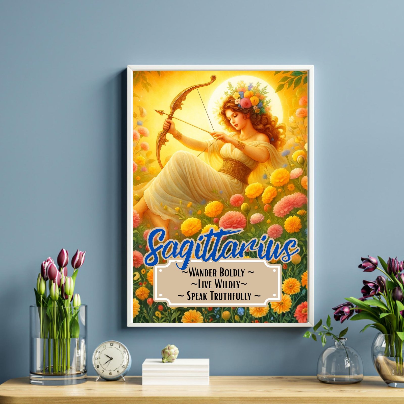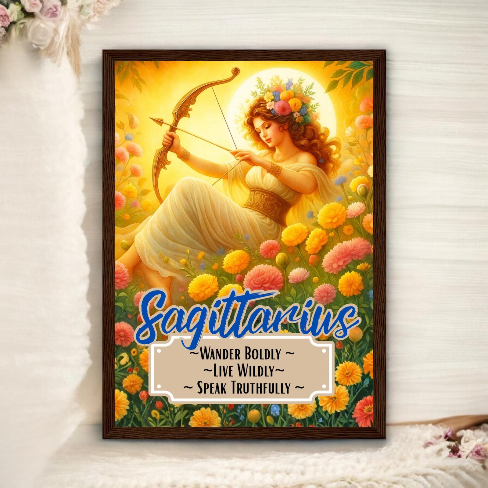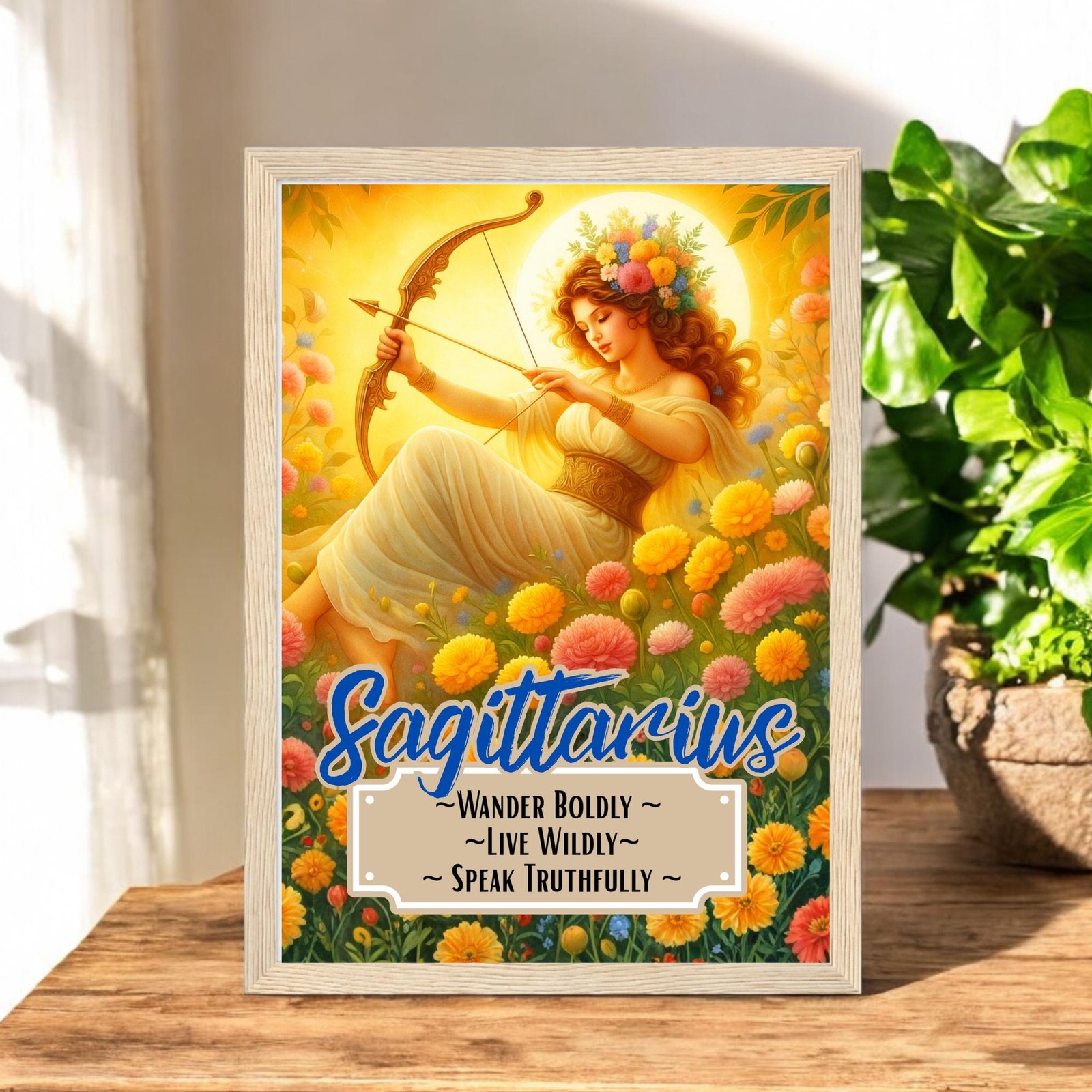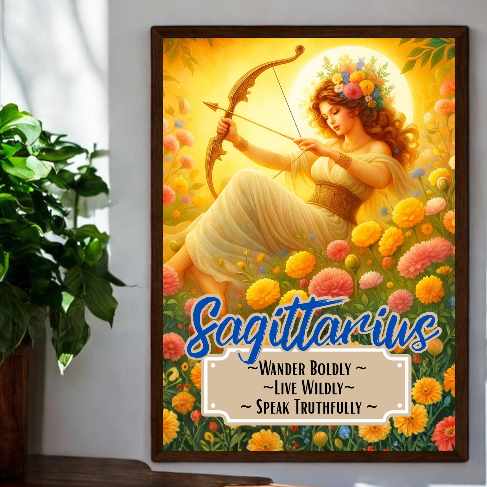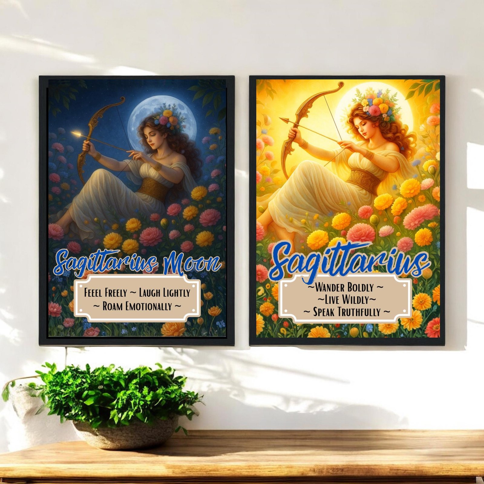 Bring the radiant, untamed spirit of Sagittarius into your home with these stunning zodiac goddess prints. Choose from the golden warmth of the Sagittarius Sun or the deep emotional wisdom of the Sagittarius Moon, each one illustrated with lush floral surroundings and divine energy.