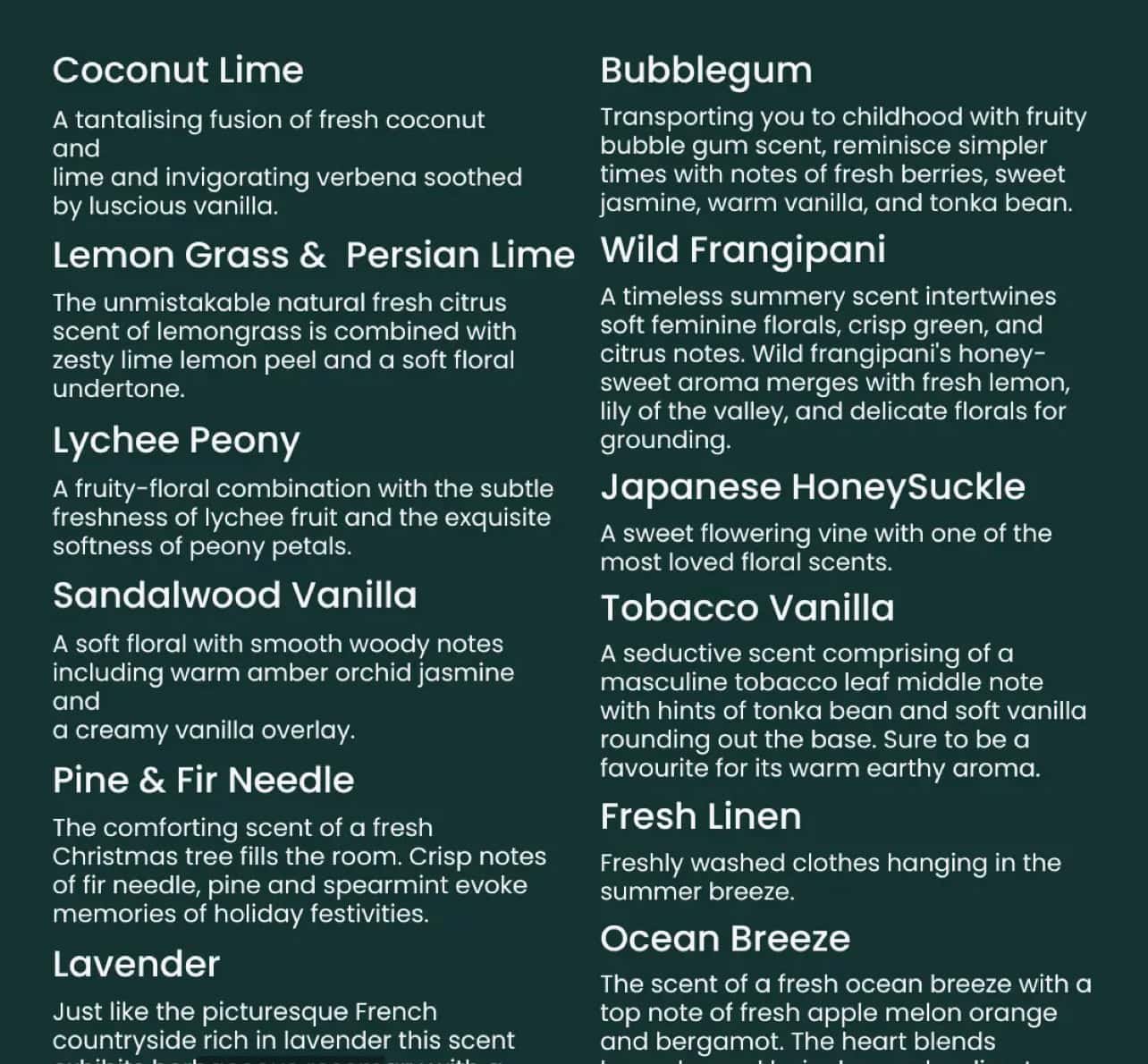 | Fragrance | Coconut Lime, Persian Lime & Lemongrass, Lychee Peony, Sandalwood Vanilla, Japanese Honeysuckle, Wild Frangapani, Bubblegum, Tobacco Vanilla, Pine & Fir Needle, Lavender, Linen, Ocean Breeze |