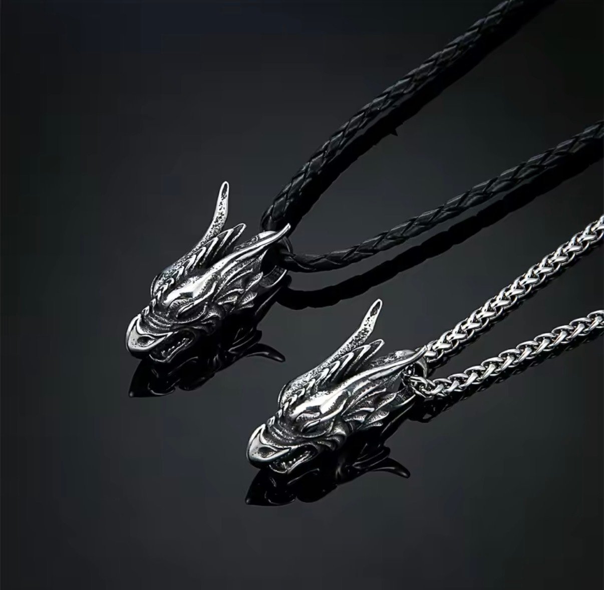 Stainless Steel Dragon Head Necklace – Silver Rope Chain or Leather Cord
