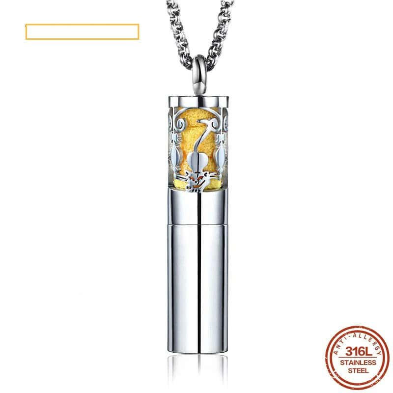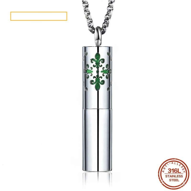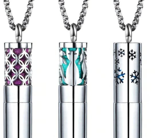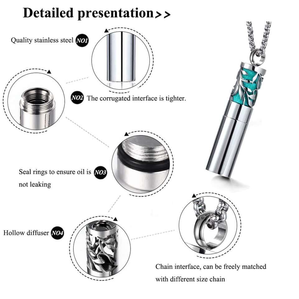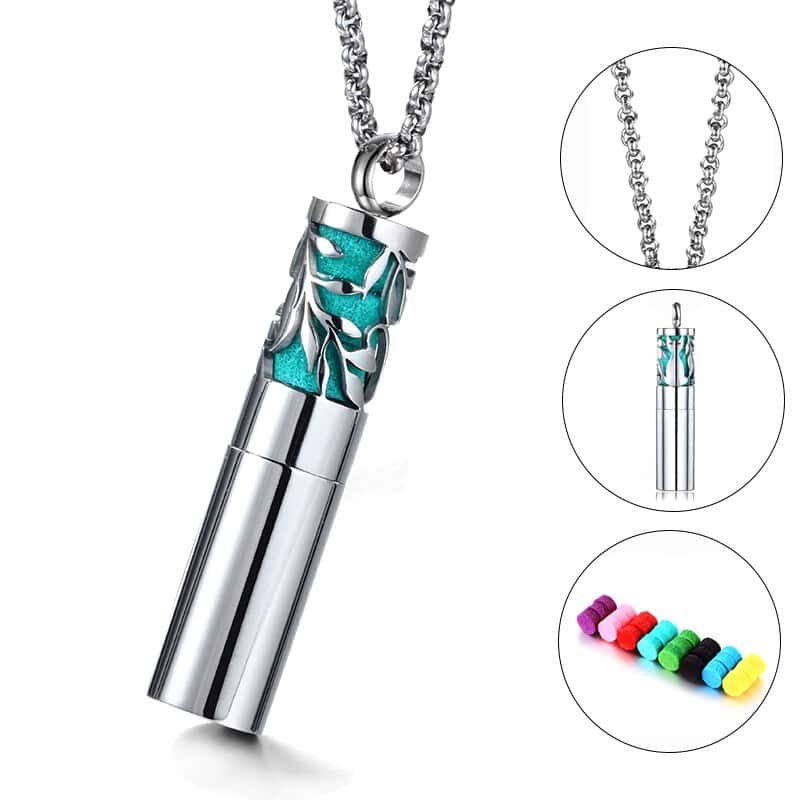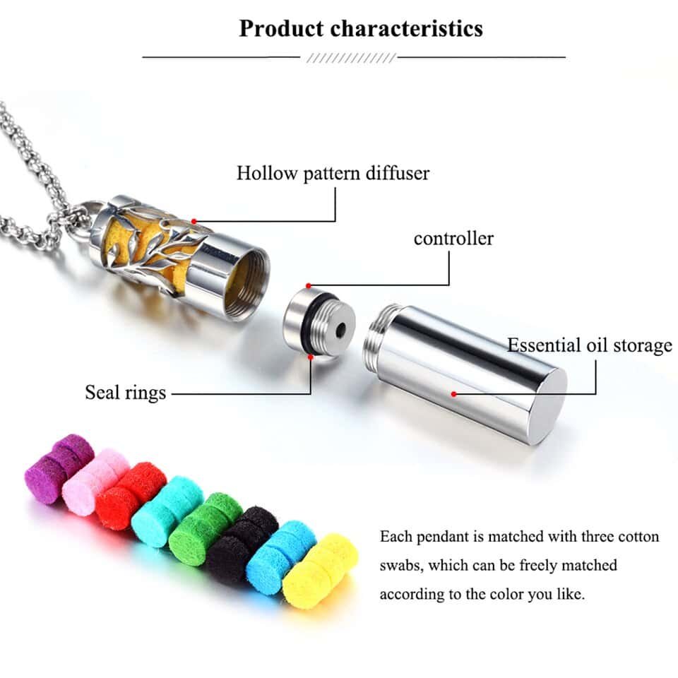 Beautiful designs cut into the steel make these aromatherapy necklaces a fabulous fashion accessory.