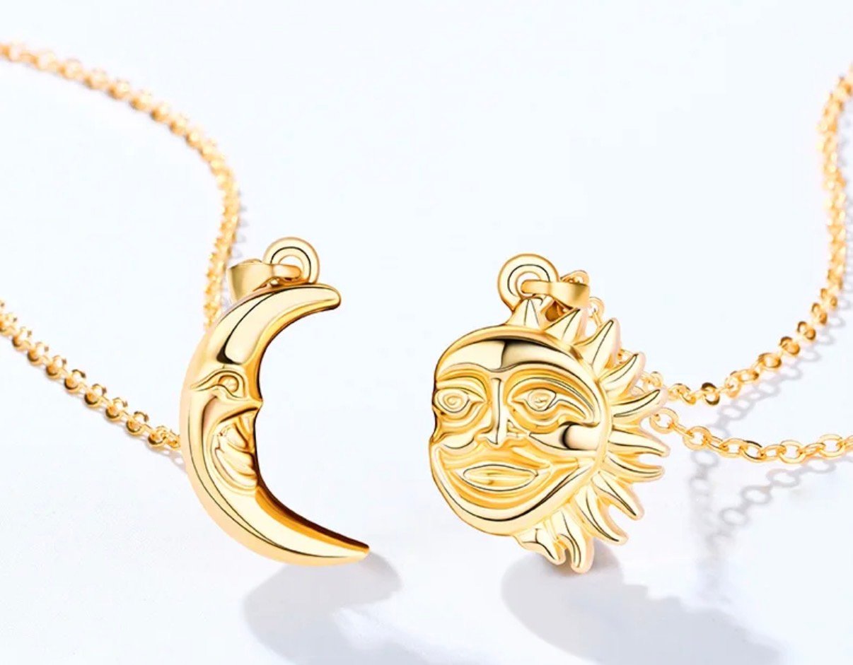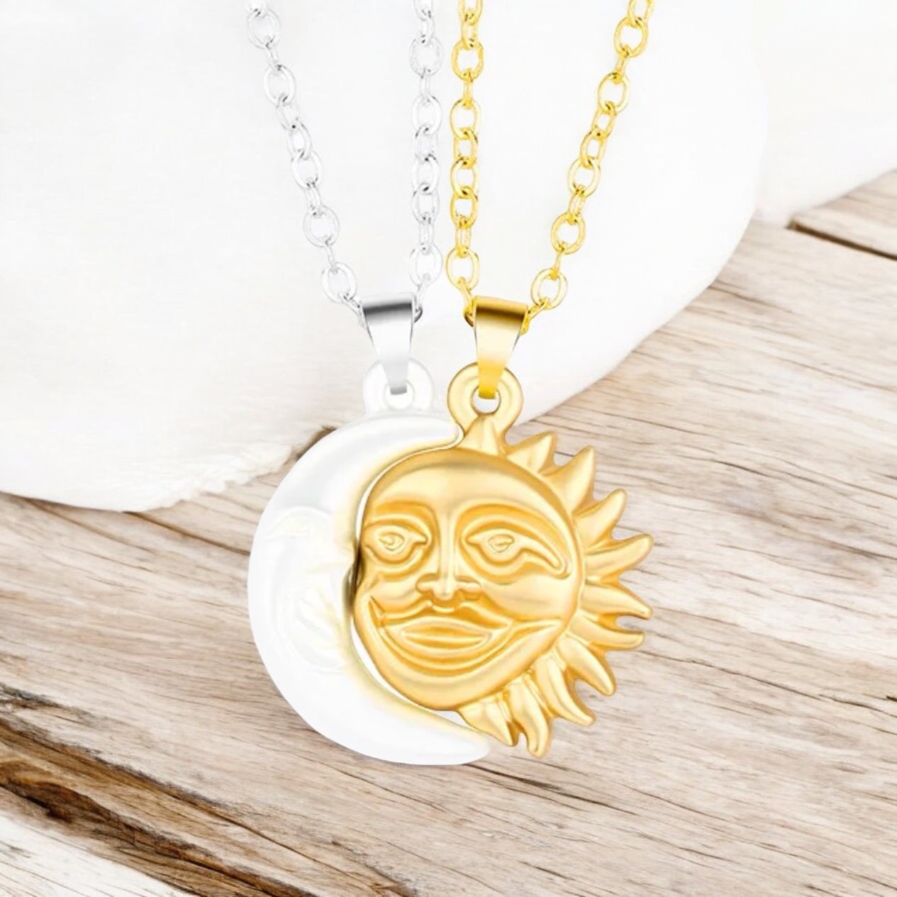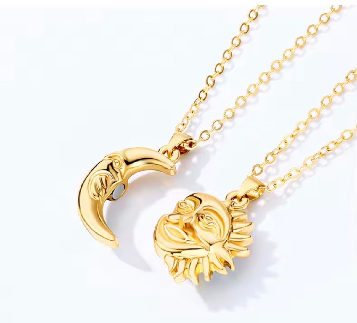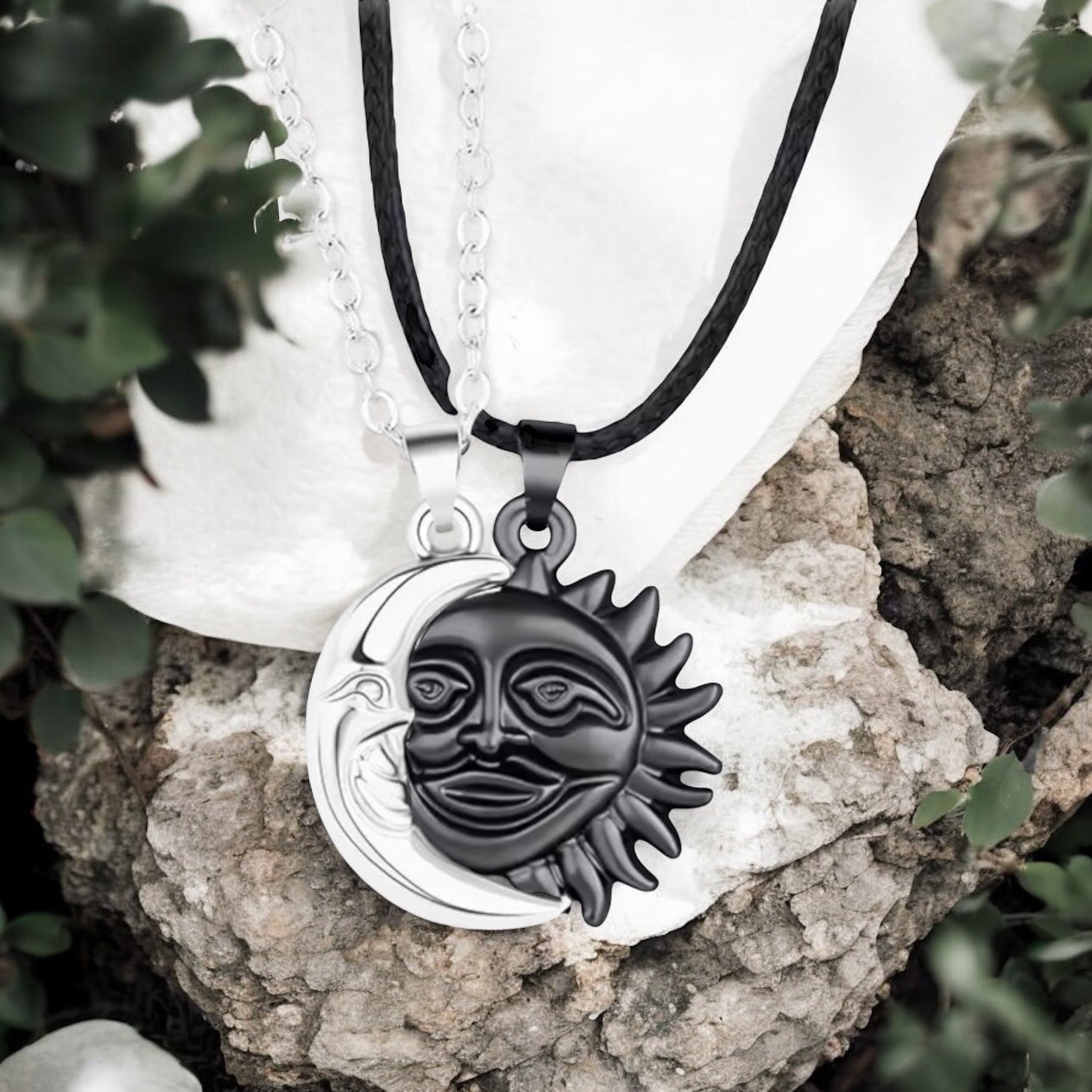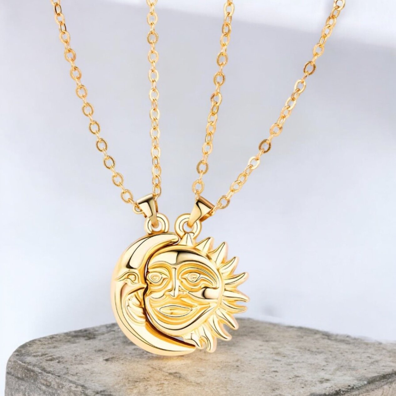 Crafted from durable stainless steel and available in gold, silver, and black finishes, each necklace features a detailed celestial design: the radiant sun paired with the serene crescent moon. When brought together, the pendants magnetically attract, making them a meaningful gift for couples, best friends, or soulmates.