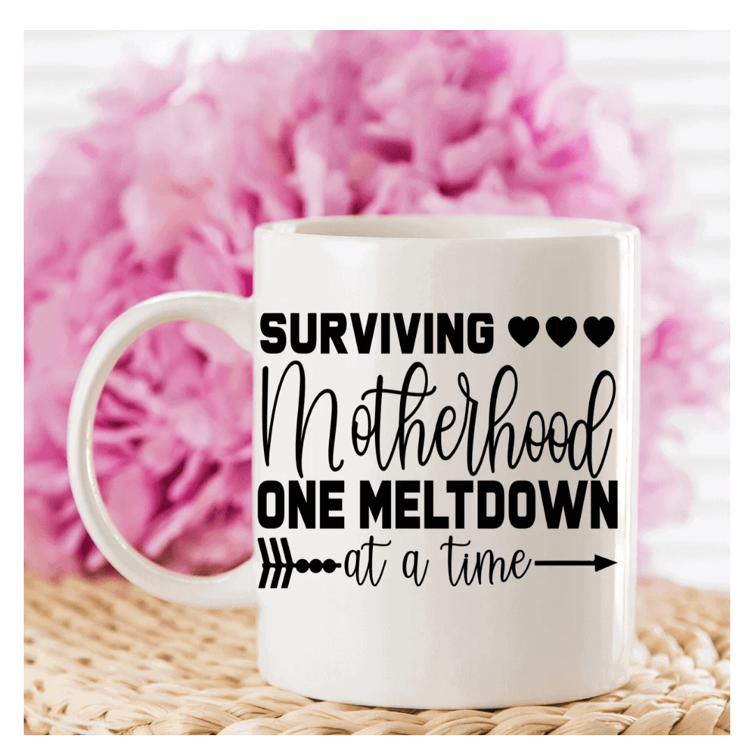 Surviving Motherhood one meltdown at a time mug or wine glass.