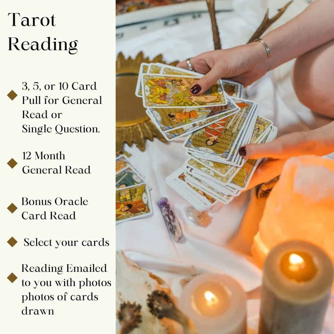 Learn what lies ahead with a Tarot Card Reading. Select from 3-10 cards or select a 12 month read. Emailed to you within 24 hours.