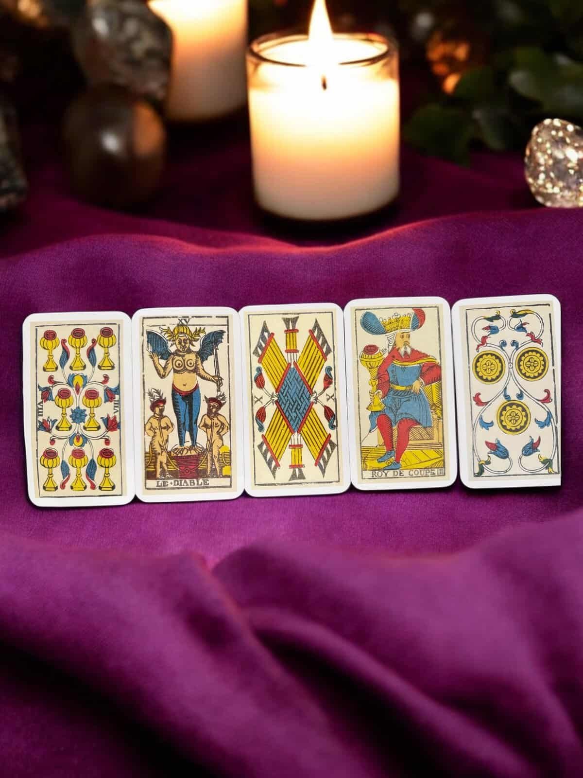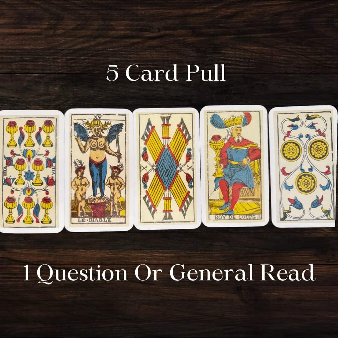 Using the Marseilles Tarot Deck, I split, Shuffle and pull the cards as selected by you from the deck.