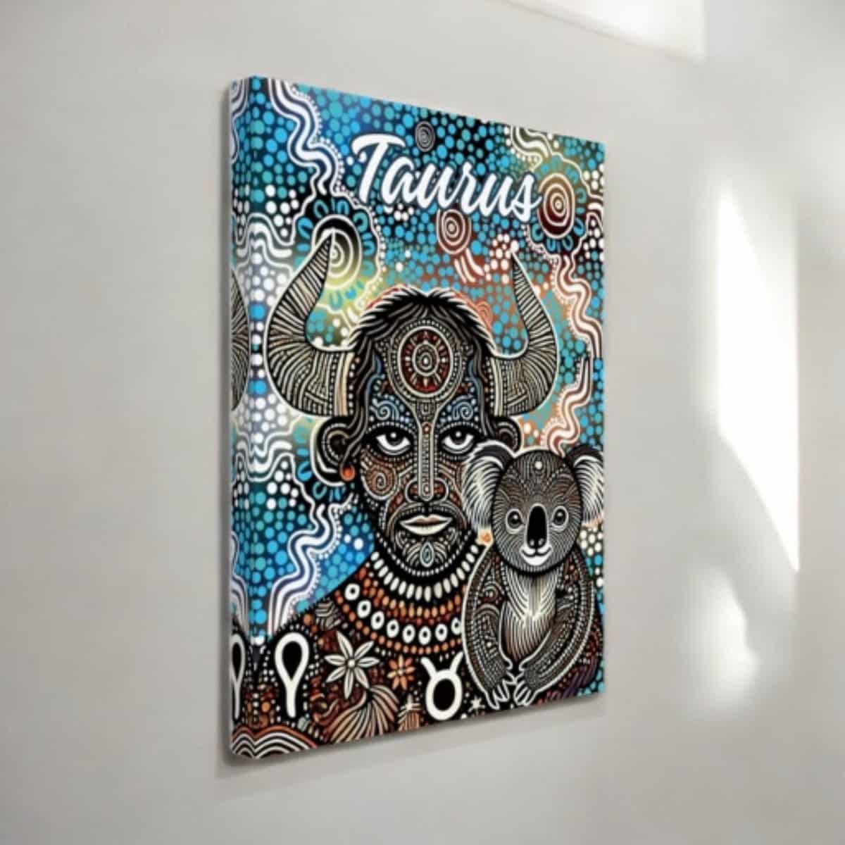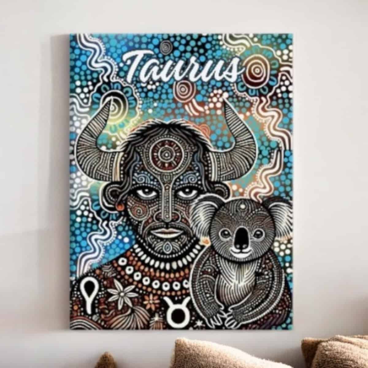 Taurus horned man with koala aboriginal zodiac dot art canvas. Traditional and cultural astrology come together to inspire this unique artwork.