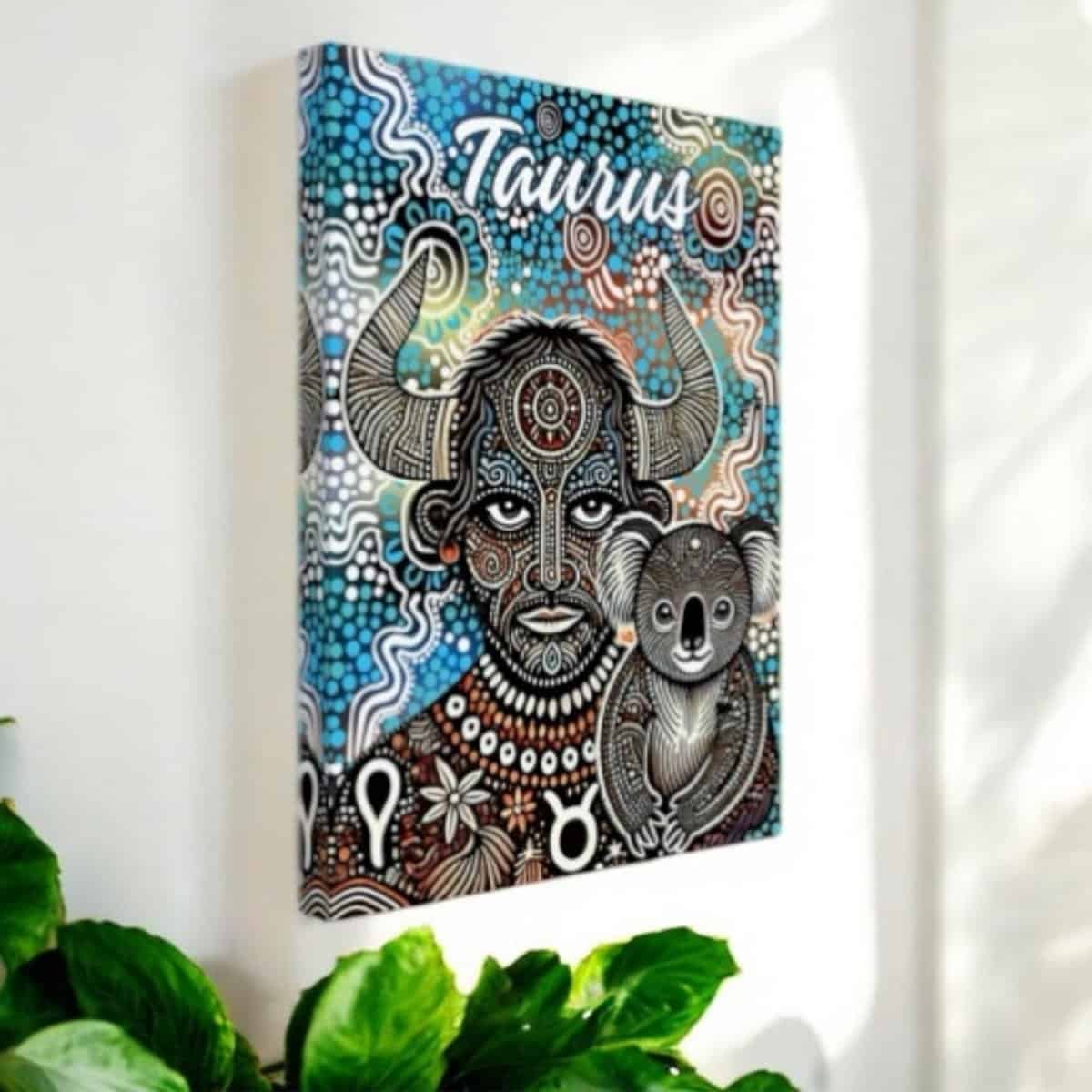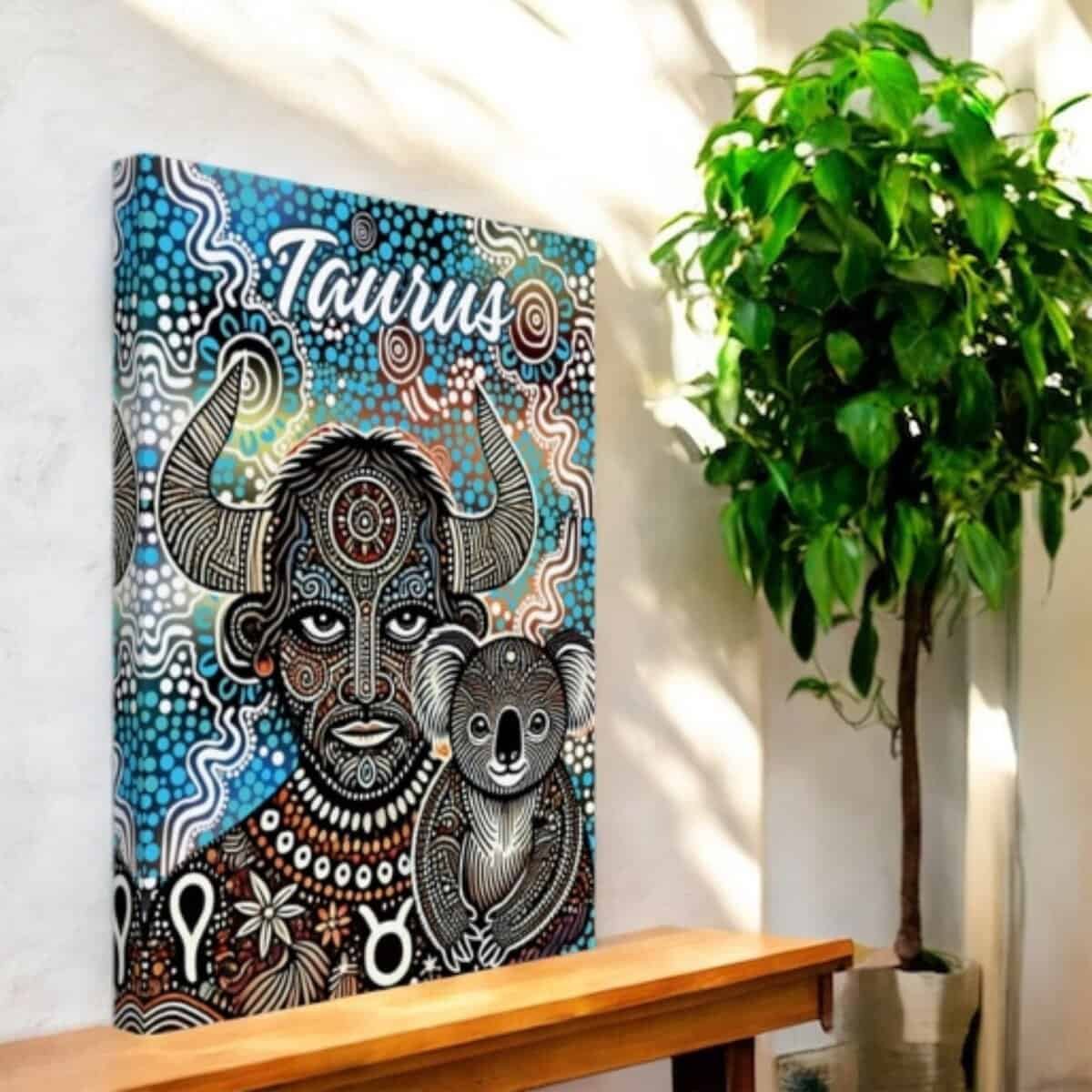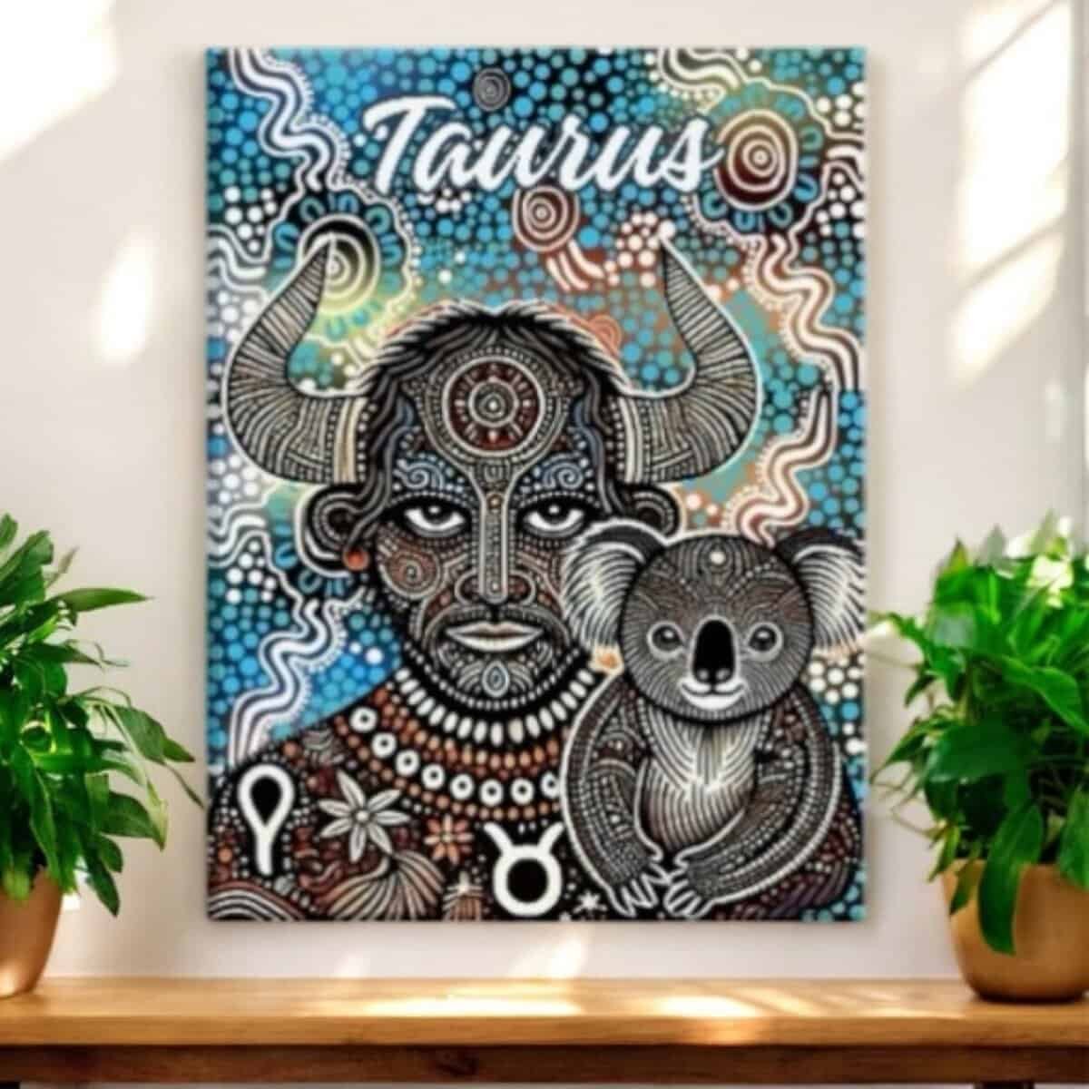 Taurus Bull Horn Man with Koala Aboriginal Zodiac Dot Art Canvas Copy