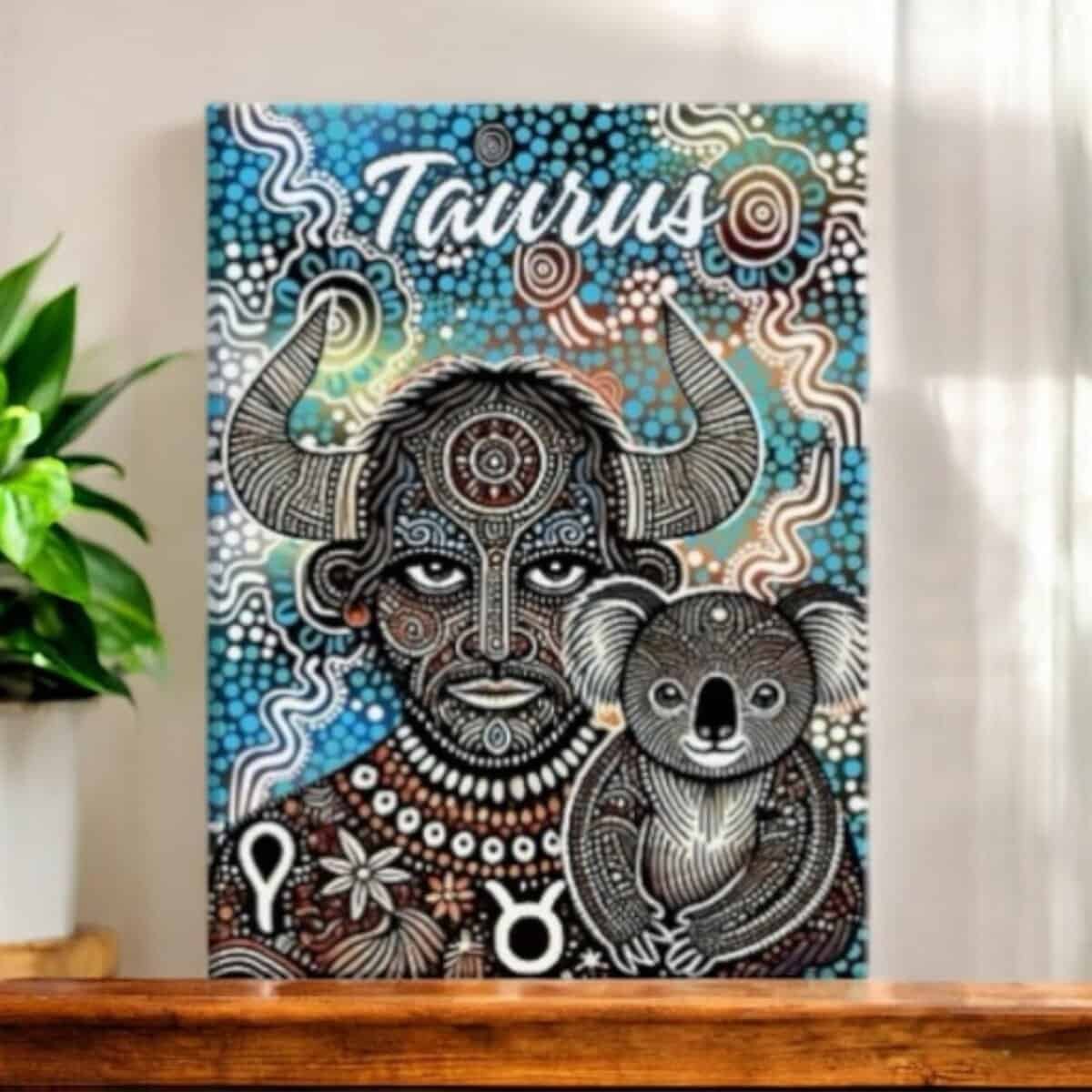 The image is a vibrant and detailed artwork featuring the zodiac sign Taurus. It depicts a stylised male figure with bull horns, symbolising Taurus, alongside a koala which is the Aboriginal sign for Taurus. The background is filled with intricate patterns, dots, and swirls in various colors, creating a lively and dynamic effect. The word “Taurus” is prominently displayed at the top. The overall style is of Aboriginal art with its use of dot painting and earthy tones and blue hues.