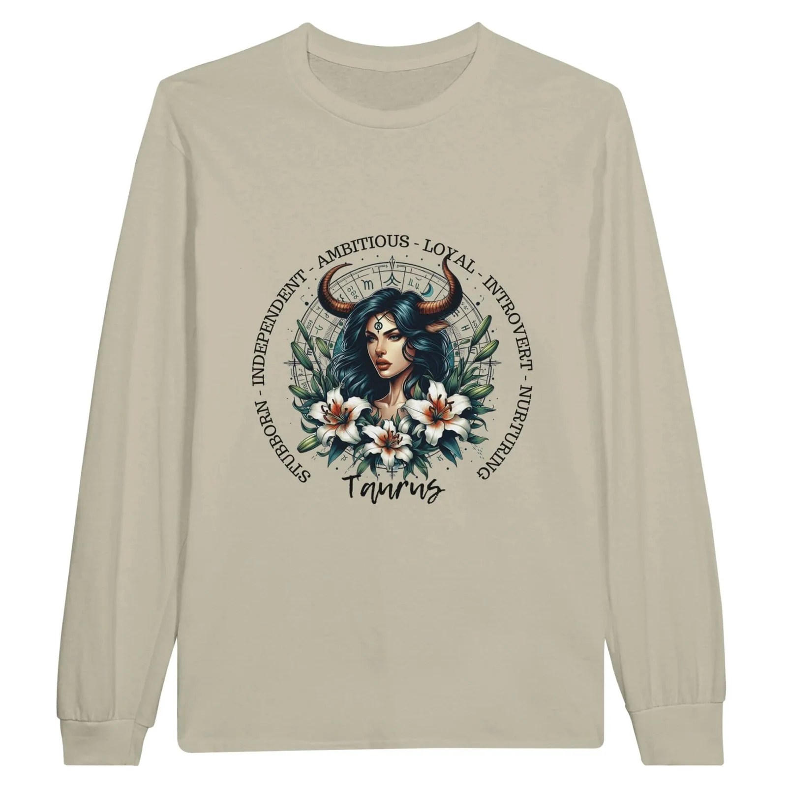 Perfect for those cooler days this cotton long sleeve shirt features our Taurus horned woman, with zodiac wheel and lily’s as well as the traits of our Taurus lady friends.
