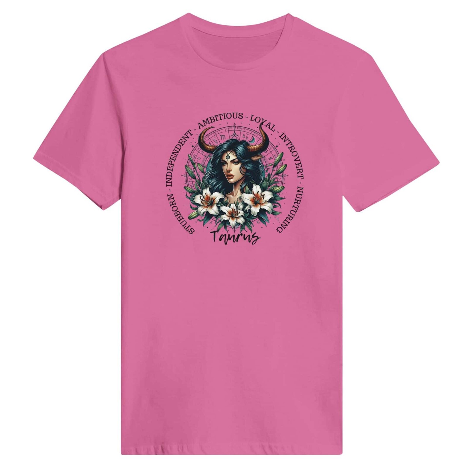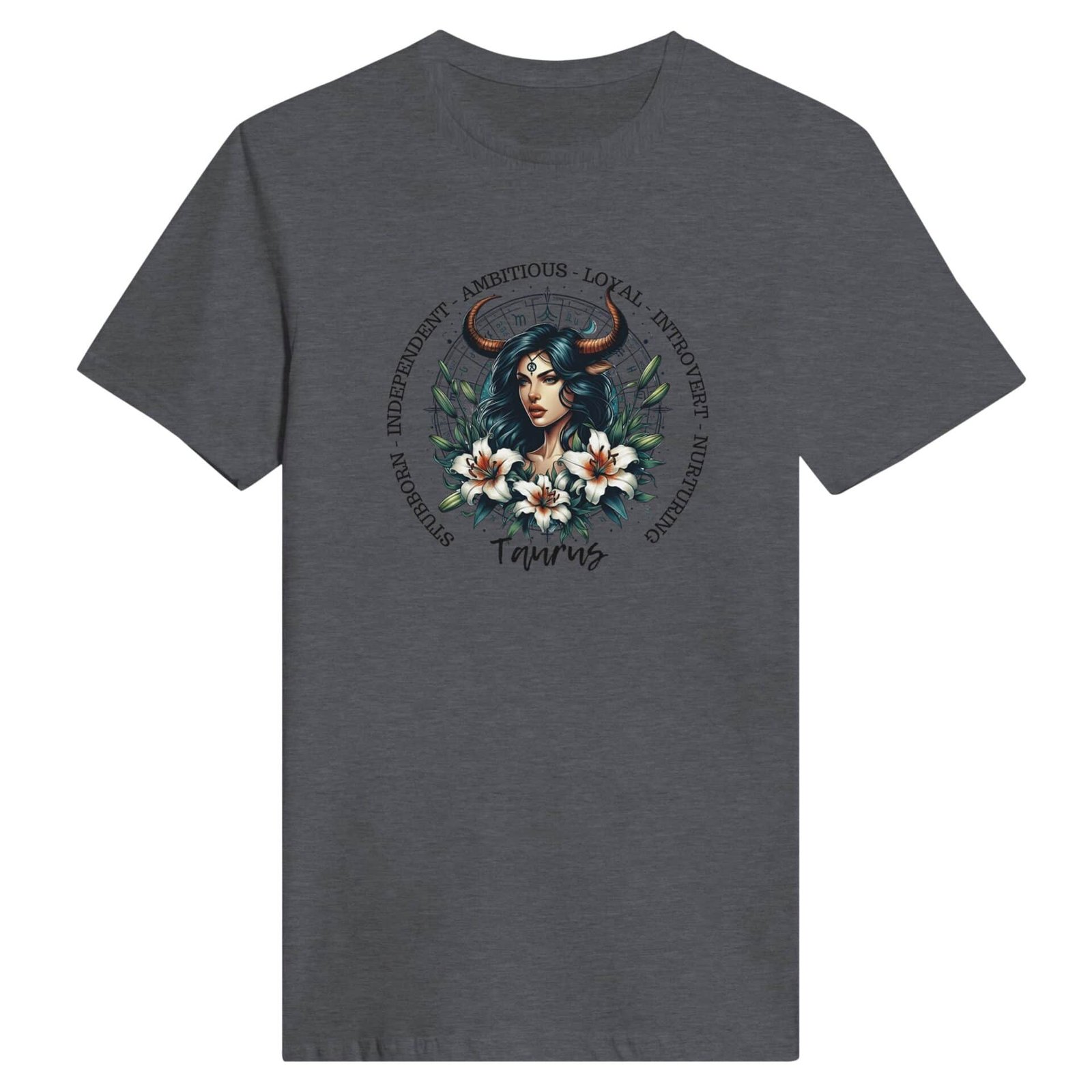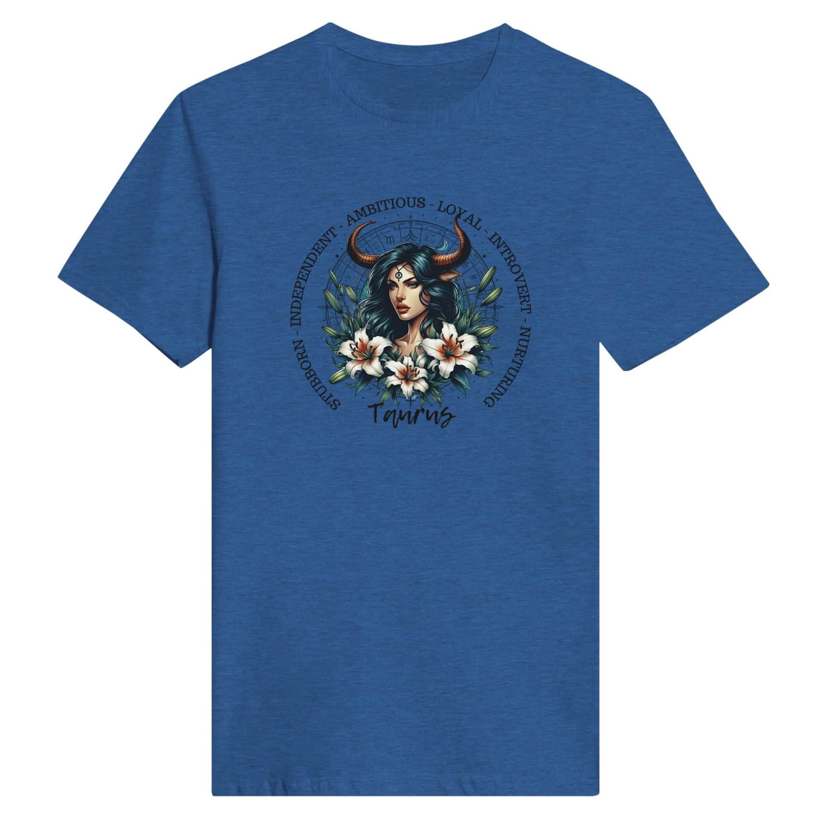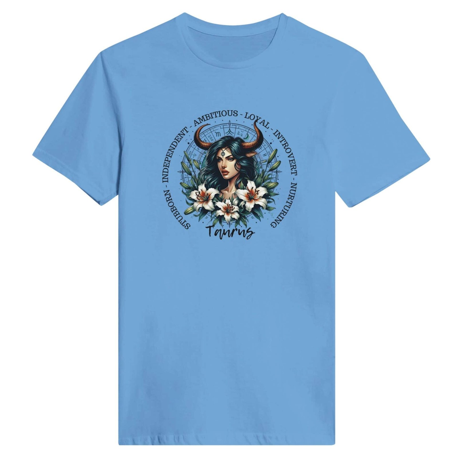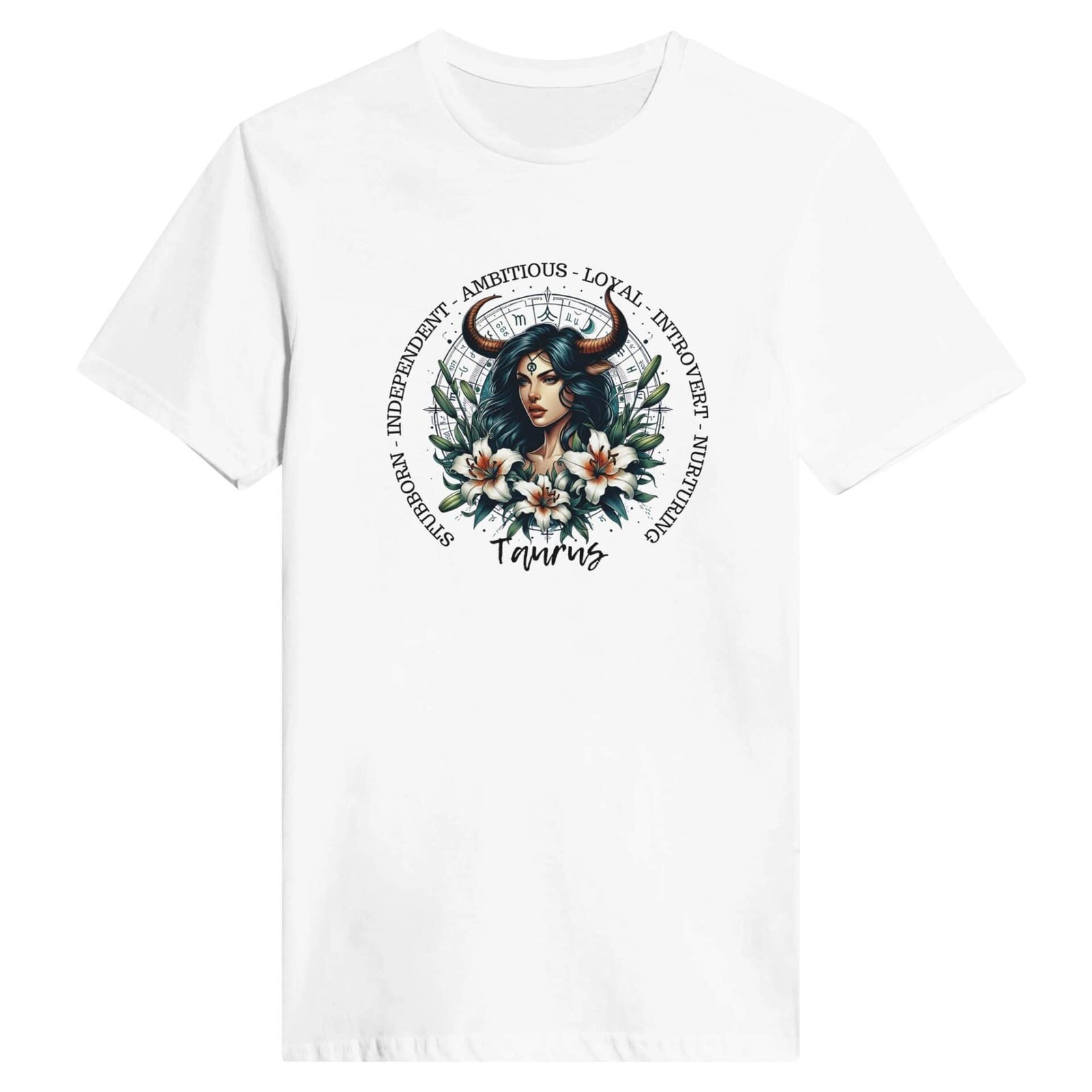 Our beautiful horned woman with astrology wheel and lily’s with the traits of our Taurus lady friends.