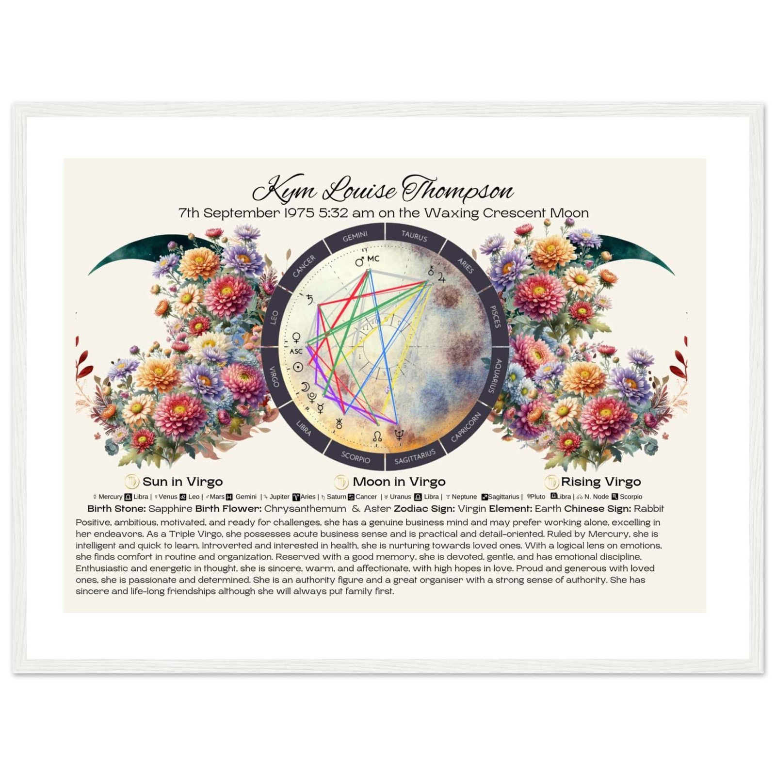 Virgo birth chart and traits personalised print. Framed or printable the Virgo traits triple moon features the birth flowers of Virgo.