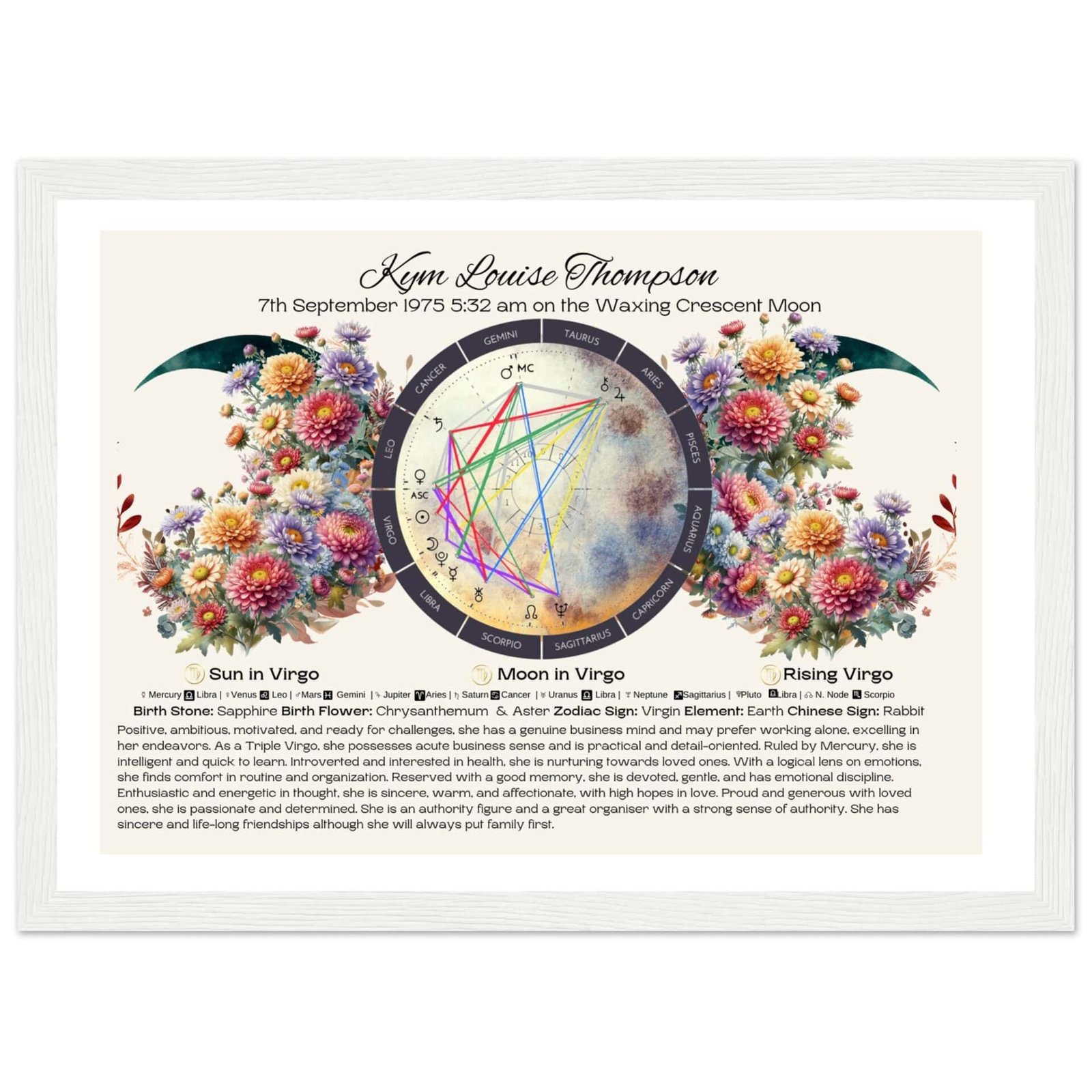 Virgo birth chart and traits personalised print. Framed or printable the Virgo traits triple moon features the birth flowers of Virgo.