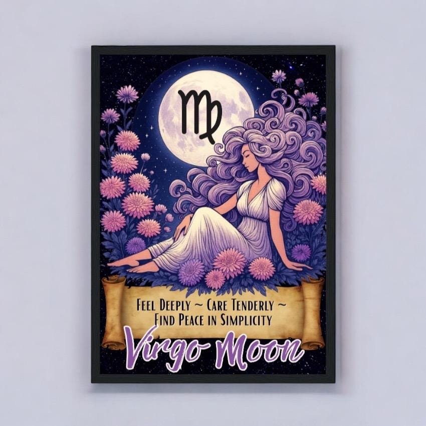 Embrace the gentle wisdom of the Virgo Moon with this beautifully illustrated framed print. Featuring a serene Virgo maiden under the glowing full moon, surrounded by blossoms, this artwork captures the essence of Virgo lunar traits: