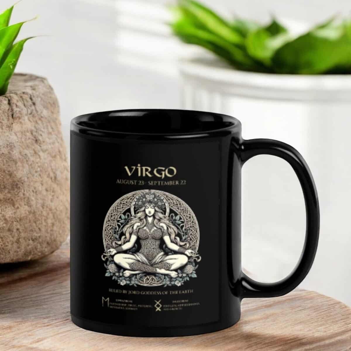 Embrace the inner warrior with our Jord Viking Norse goddess of Virgo Ceramic coffee mugs in black or white or our 16oz frosted glass beer mug.